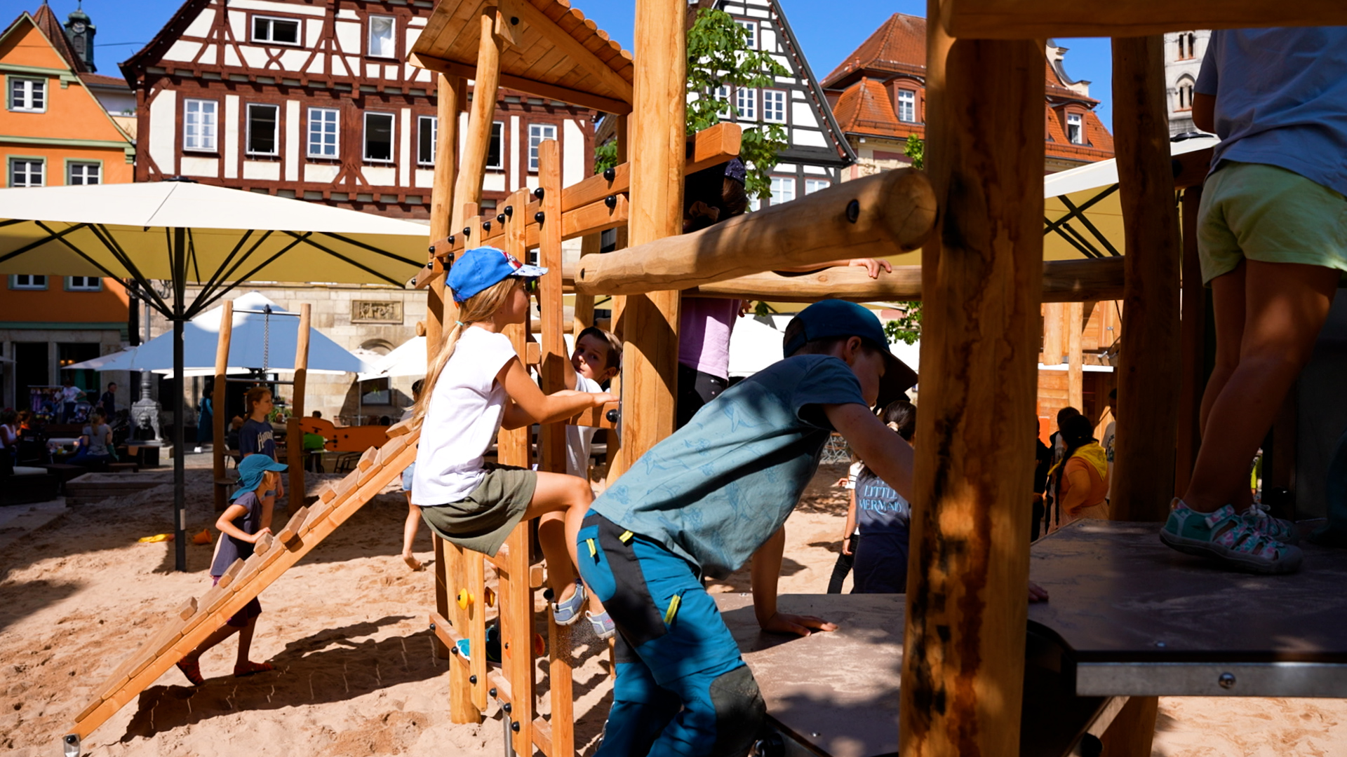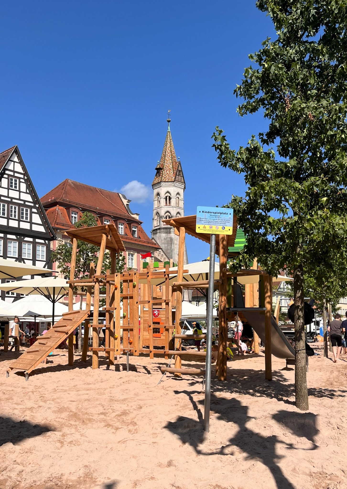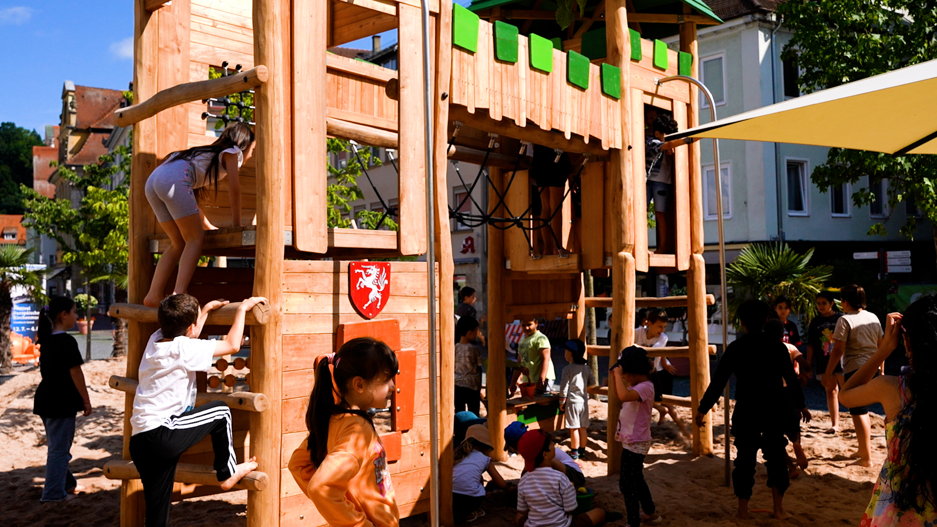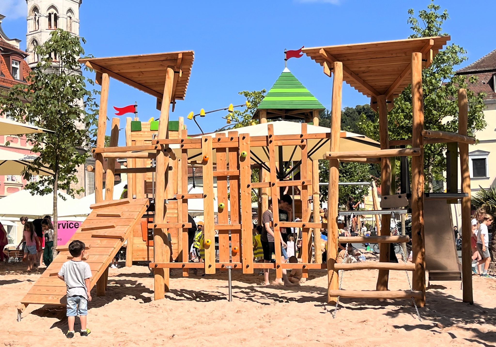 Den Sommer über erfreut er die Kinder in Schwäbisch Gmünd – der Pop-up-Naturholzspielplatz mitten auf dem Marktplatz. Die Spielgeräte aus Naturholz hat Proludic speziell auf die Wünsche der Stadt ausgerichtet. Als Stauferstadt hatten sich die Verantwortlichen aus dem Gmünder Rathaus eine Stauferburg gewünscht – Proludic hat sie als Gerät mit unterschiedlichen Spielfunktionen, unter anderem mit Spielboards und Stangenrutsche, umgesetzt. Eine Nestschaukel, ein Sandspielgerät und eine weitere Spielkombination inklusive Rutsche vervollständigen den Spielplatz für den eigens lastwagenweise Sand aufgeschüttet wurde.