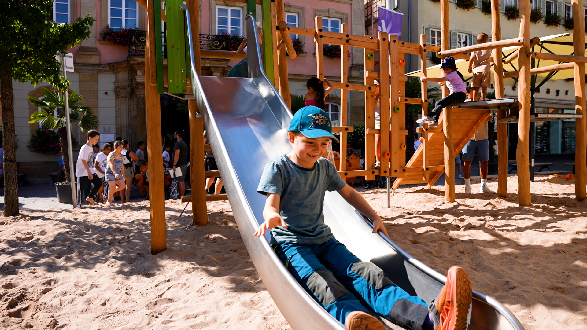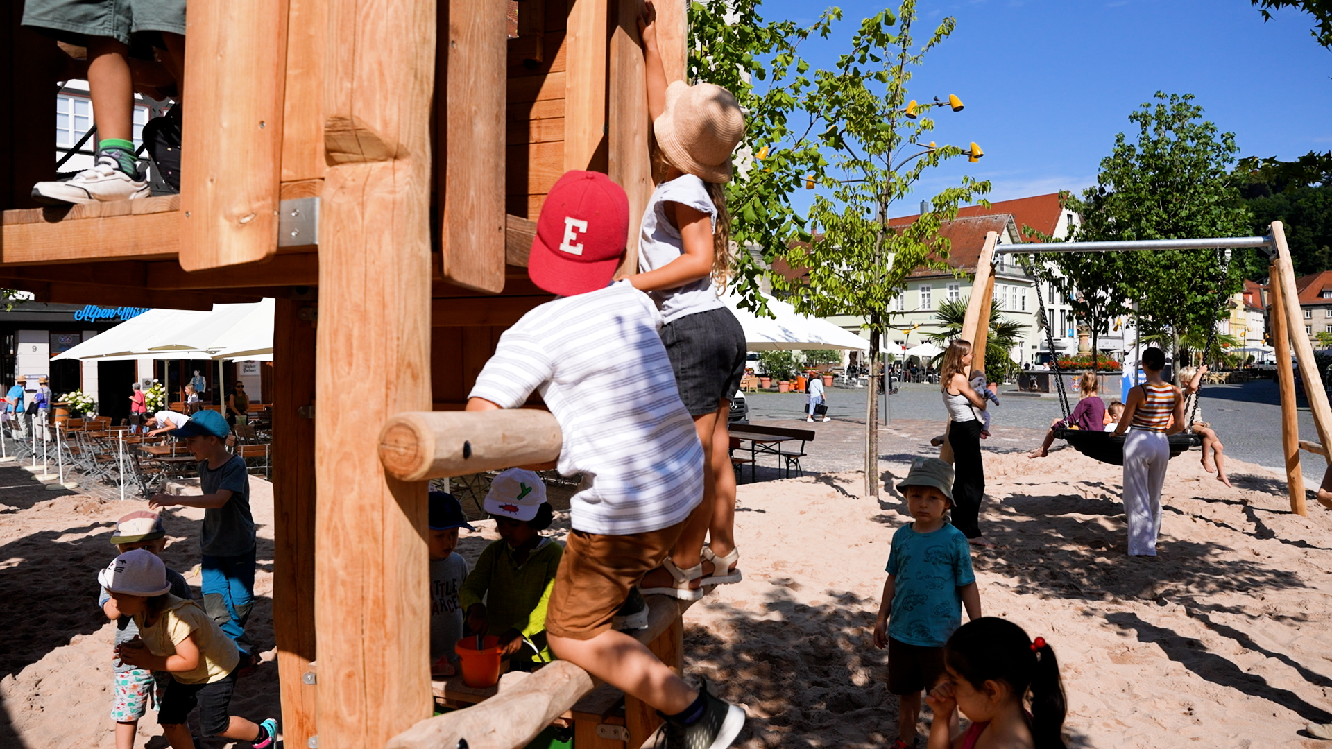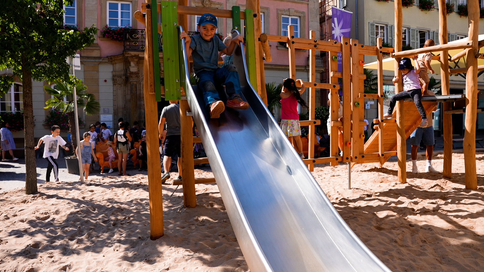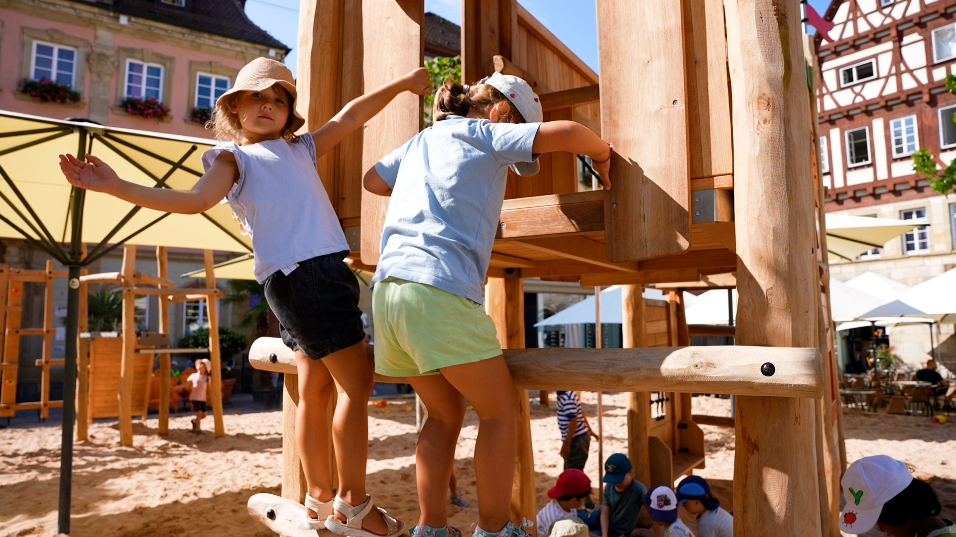Den Sommer über erfreut er die Kinder in Schwäbisch Gmünd – der Pop-up-Naturholzspielplatz mitten auf dem Marktplatz. Die Spielgeräte aus Naturholz hat Proludic speziell auf die Wünsche der Stadt ausgerichtet. Als Stauferstadt hatten sich die Verantwortlichen aus dem Gmünder Rathaus eine Stauferburg gewünscht – Proludic hat sie als Gerät mit unterschiedlichen Spielfunktionen, unter anderem mit Spielboards und Stangenrutsche, umgesetzt. Eine Nestschaukel, ein Sandspielgerät und eine weitere Spielkombination inklusive Rutsche vervollständigen den Spielplatz für den eigens lastwagenweise Sand aufgeschüttet wurde.