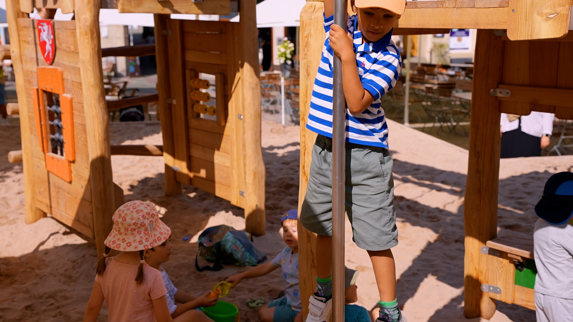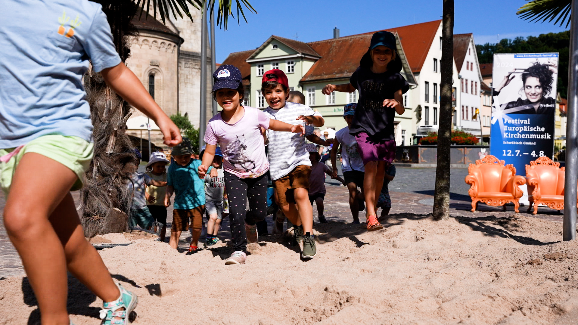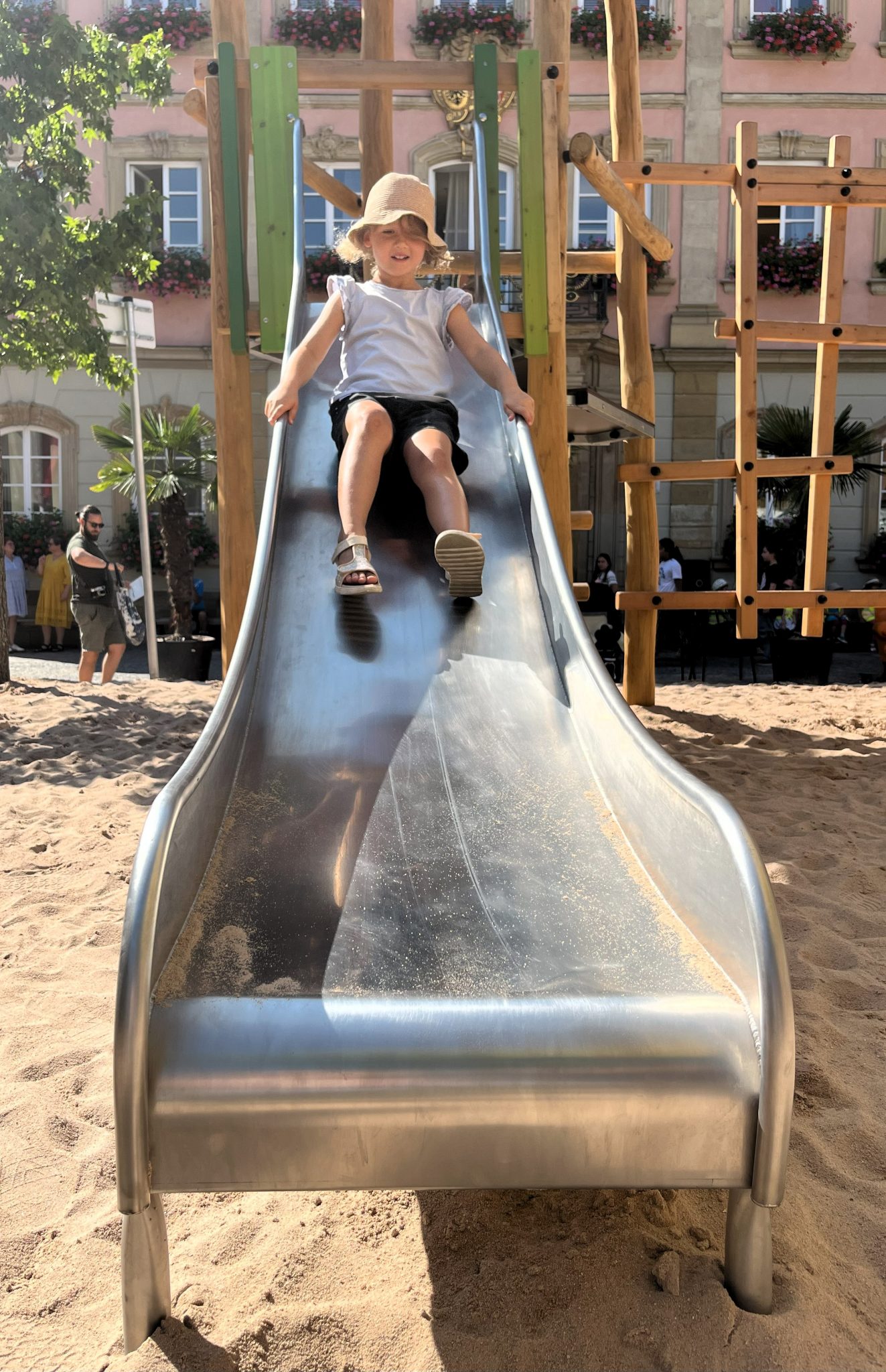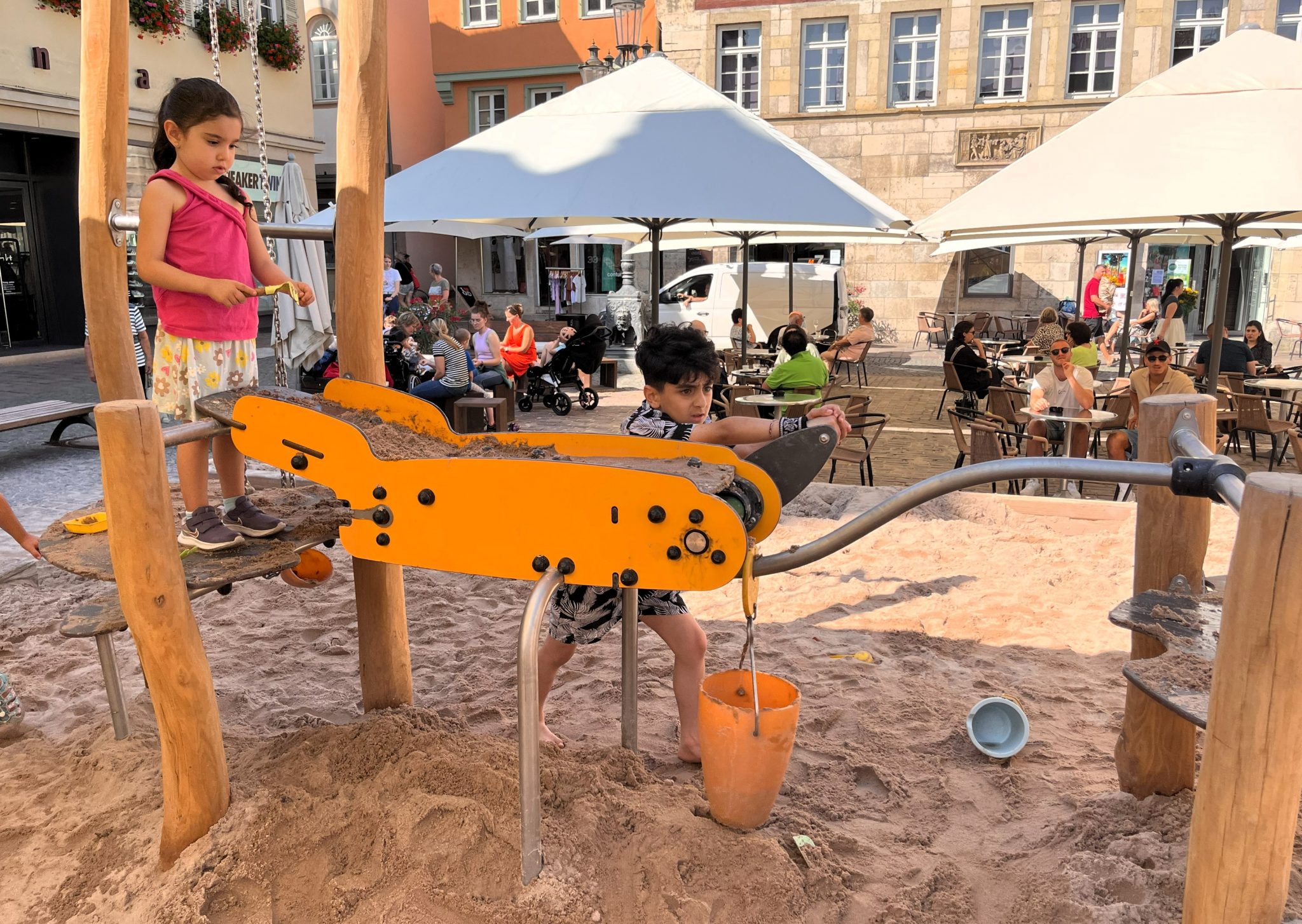 Den Sommer über erfreut er die Kinder in Schwäbisch Gmünd – der Pop-up-Naturholzspielplatz mitten auf dem Marktplatz. Die Spielgeräte aus Naturholz hat Proludic speziell auf die Wünsche der Stadt ausgerichtet. Als Stauferstadt hatten sich die Verantwortlichen aus dem Gmünder Rathaus eine Stauferburg gewünscht – Proludic hat sie als Gerät mit unterschiedlichen Spielfunktionen, unter anderem mit Spielboards und Stangenrutsche, umgesetzt. Eine Nestschaukel, ein Sandspielgerät und eine weitere Spielkombination inklusive Rutsche vervollständigen den Spielplatz für den eigens lastwagenweise Sand aufgeschüttet wurde.