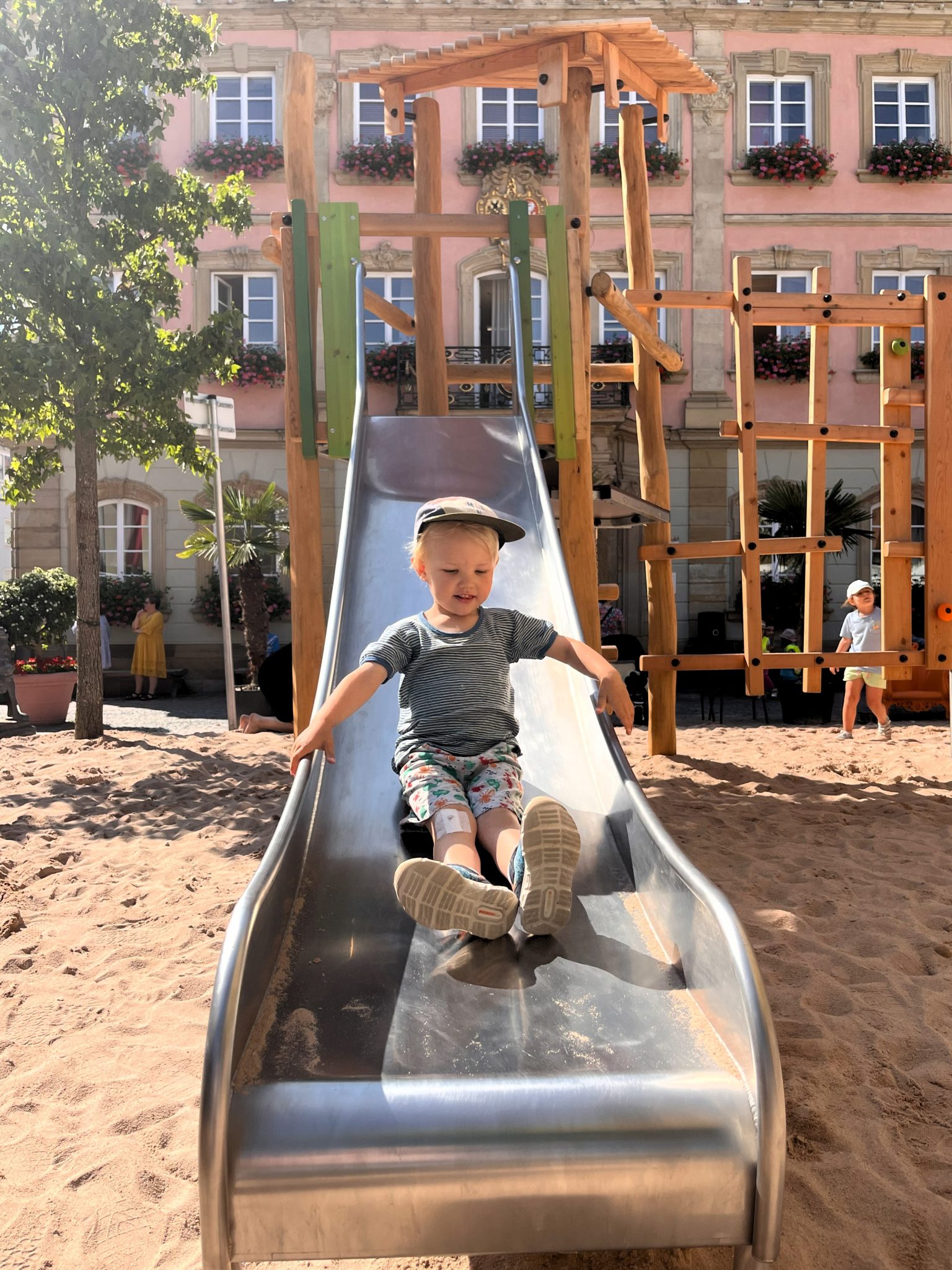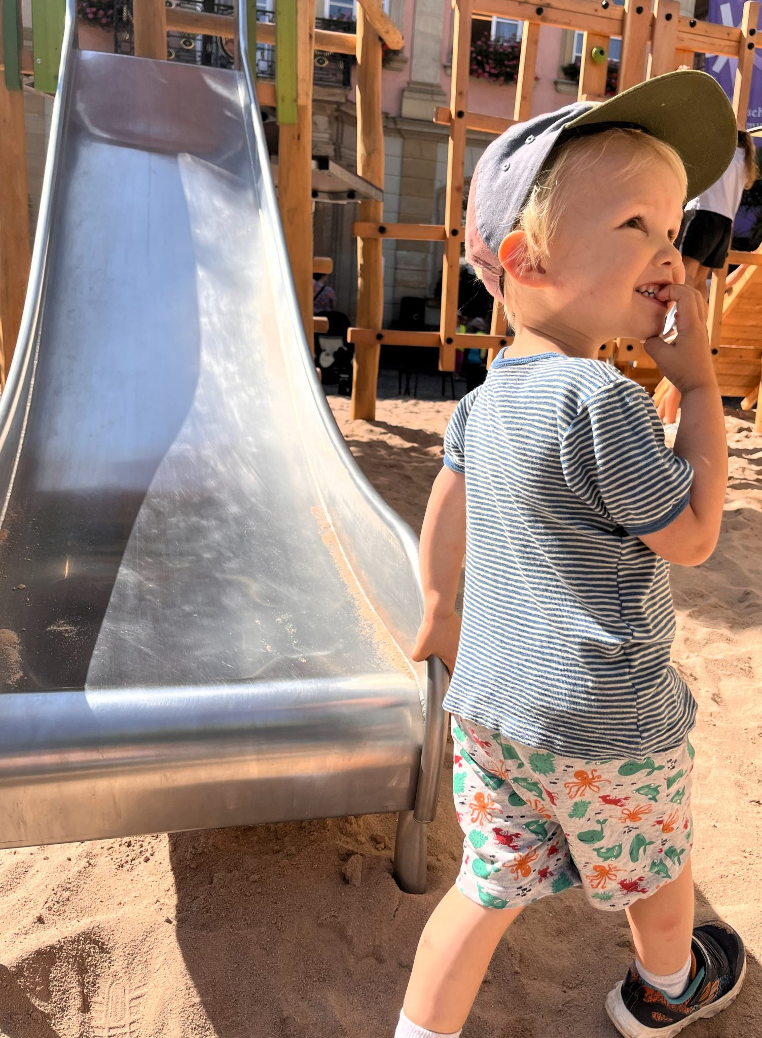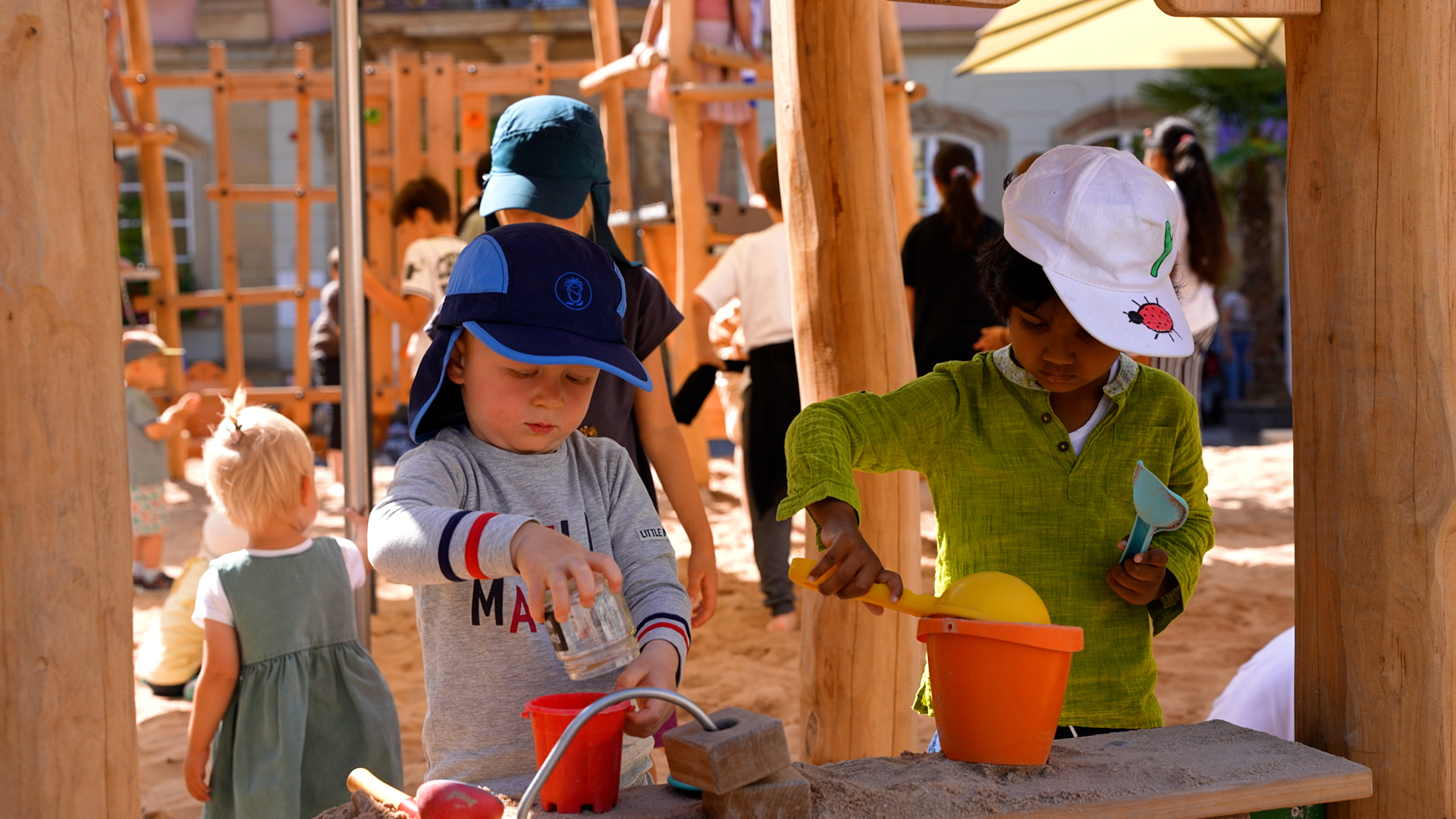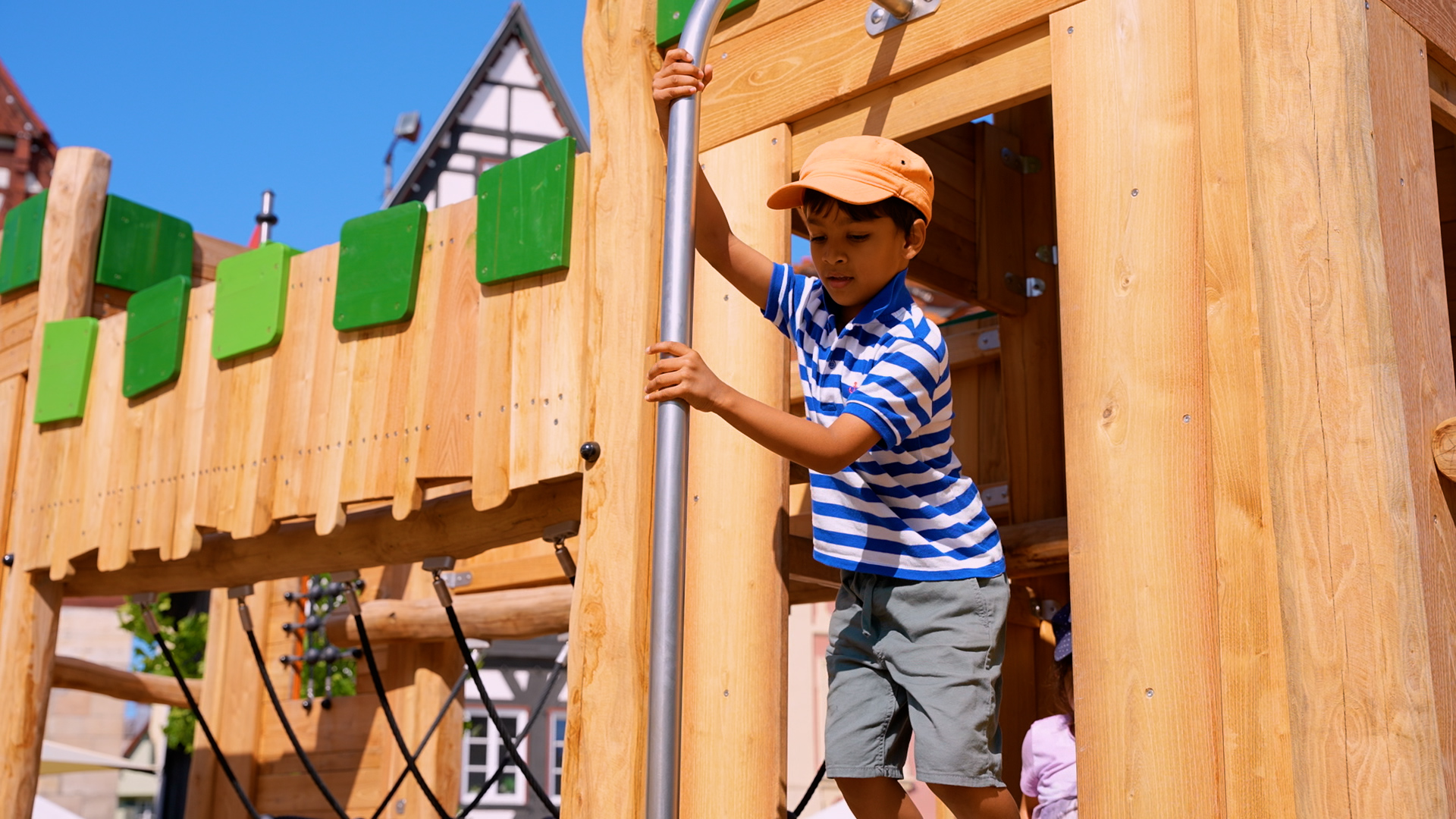 Den Sommer über erfreut er die Kinder in Schwäbisch Gmünd – der Pop-up-Naturholzspielplatz mitten auf dem Marktplatz. Die Spielgeräte aus Naturholz hat Proludic speziell auf die Wünsche der Stadt ausgerichtet. Als Stauferstadt hatten sich die Verantwortlichen aus dem Gmünder Rathaus eine Stauferburg gewünscht – Proludic hat sie als Gerät mit unterschiedlichen Spielfunktionen, unter anderem mit Spielboards und Stangenrutsche, umgesetzt. Eine Nestschaukel, ein Sandspielgerät und eine weitere Spielkombination inklusive Rutsche vervollständigen den Spielplatz für den eigens lastwagenweise Sand aufgeschüttet wurde.