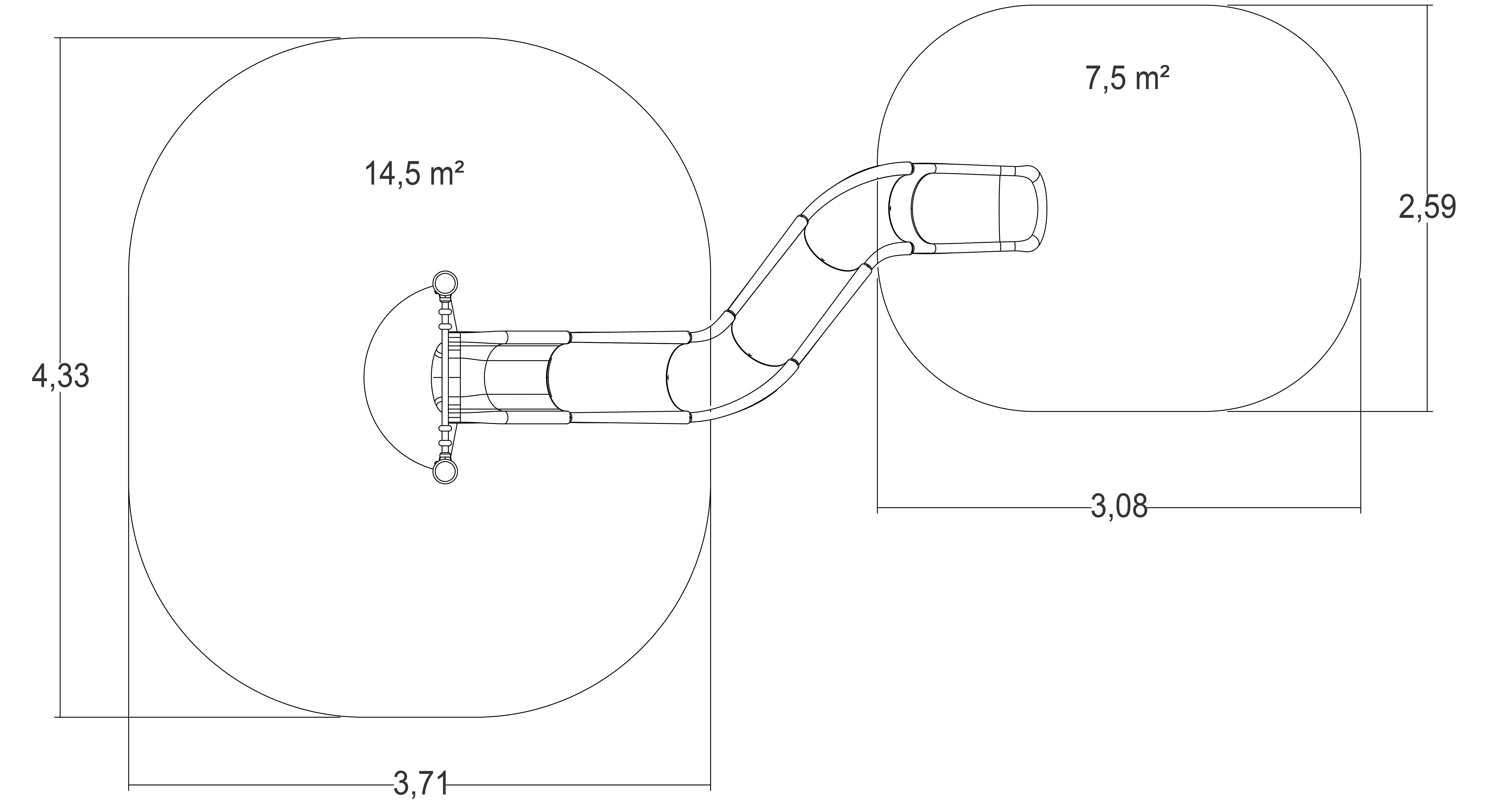 Das Modul hat folgende Abmessungen: 4,40 m Länge, 2,05 m Breite, 3,80 m Höhe. Die Fallhöhe beträgt 1,00 m.