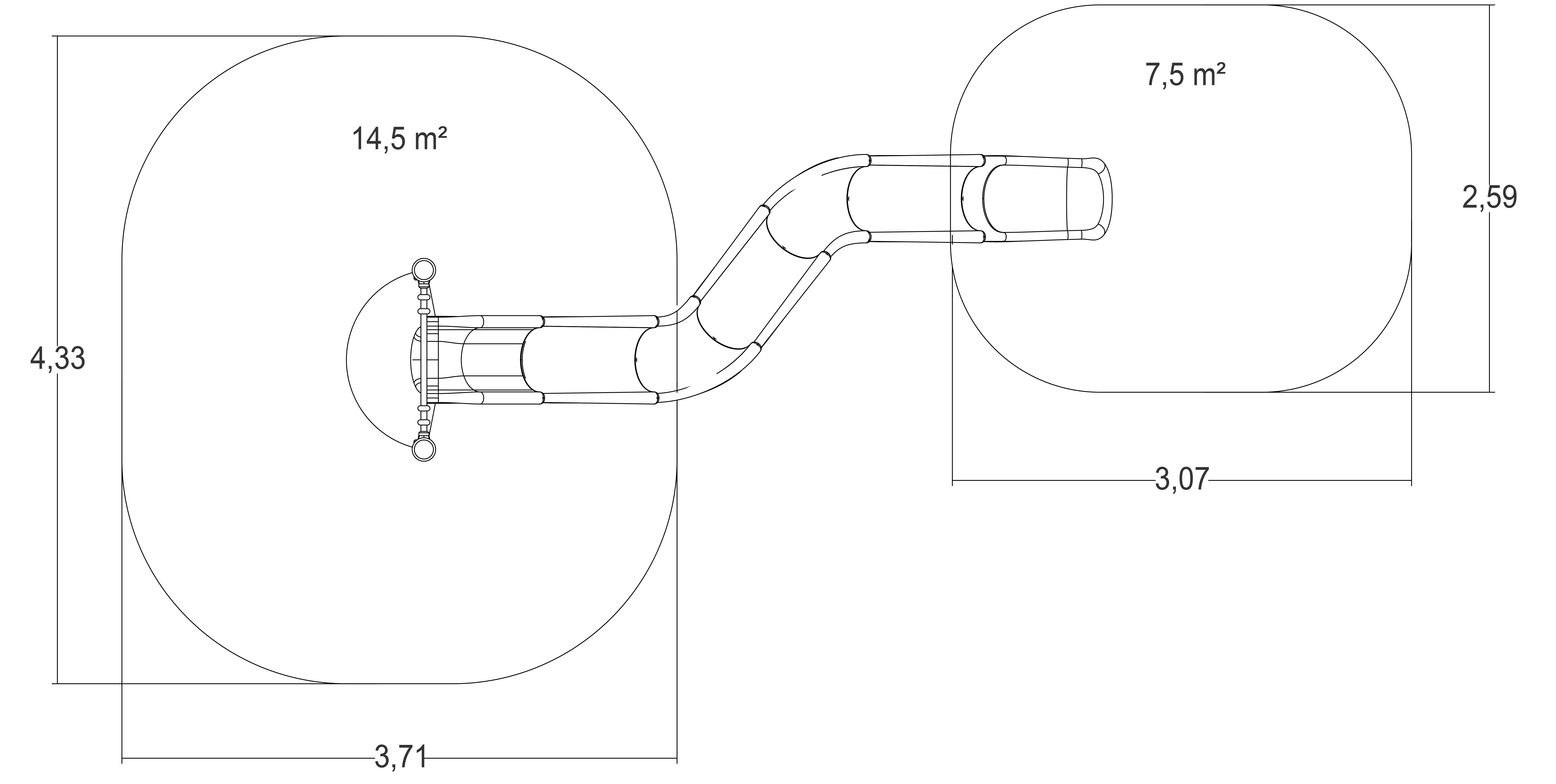 Das Modul hat folgende Abmessungen: 5,12 m Länge, 2,05 m Breite, 4,30 m Höhe. Die Fallhöhe beträgt 1,00 m.