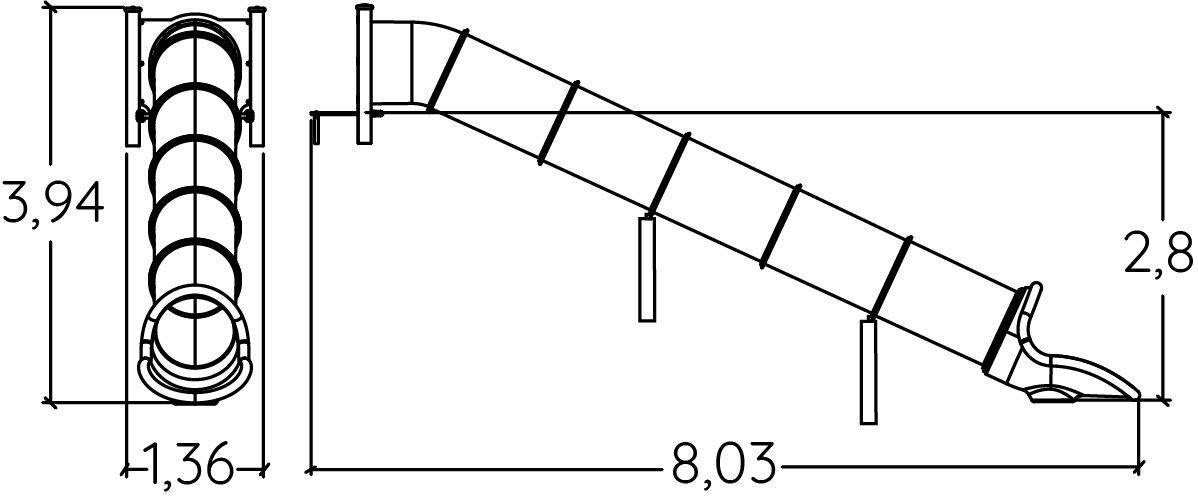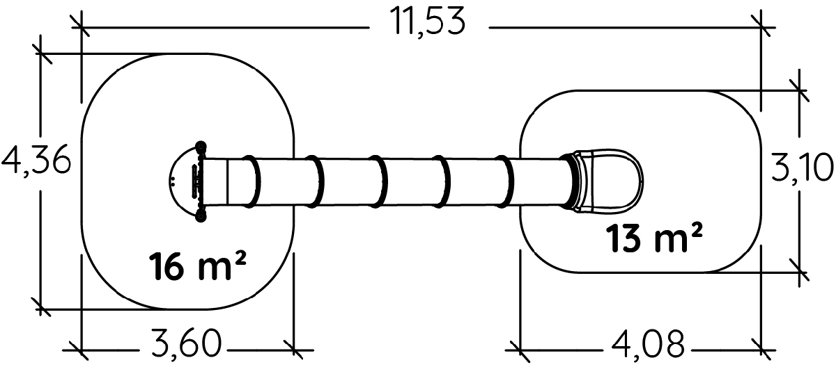 Das Modul hat folgende Abmessungen: 8,03 m Länge, 1,36 m Breite, 3,94 m Höhe. Die Fallhöhe beträgt 1,00 m.