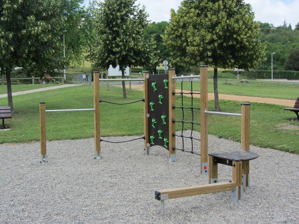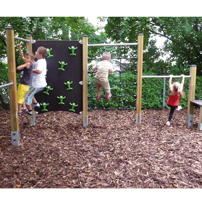 Kletterkombination aus Holz mit Kletterwand, Kletternetz, Seilstrecke und Balancierbalken - J1663