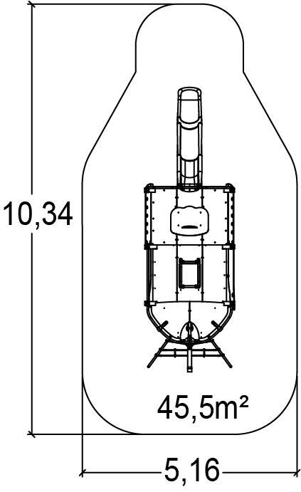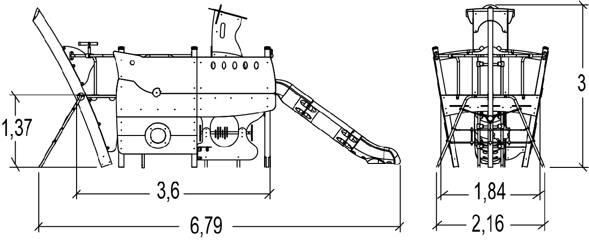 Das Modul hat folgende Abmessungen: 6,76 m Länge, 2,16 m Breite, 3,00 m Höhe. Die Fallhöhe beträgt 1,37 m.