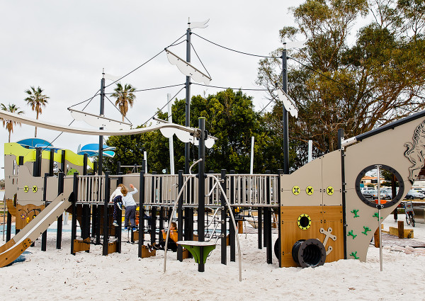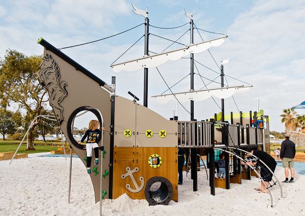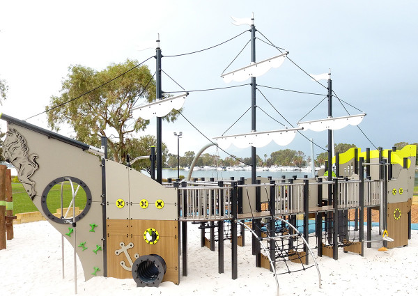 Riesiges Spielschiff „Einhorn“ mit Rutsche, Kletterelementen, Netzstrukturen und Spielboards - J1961