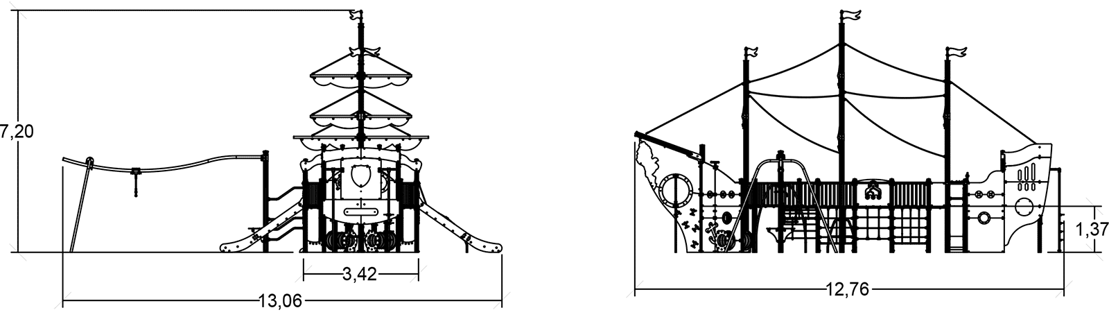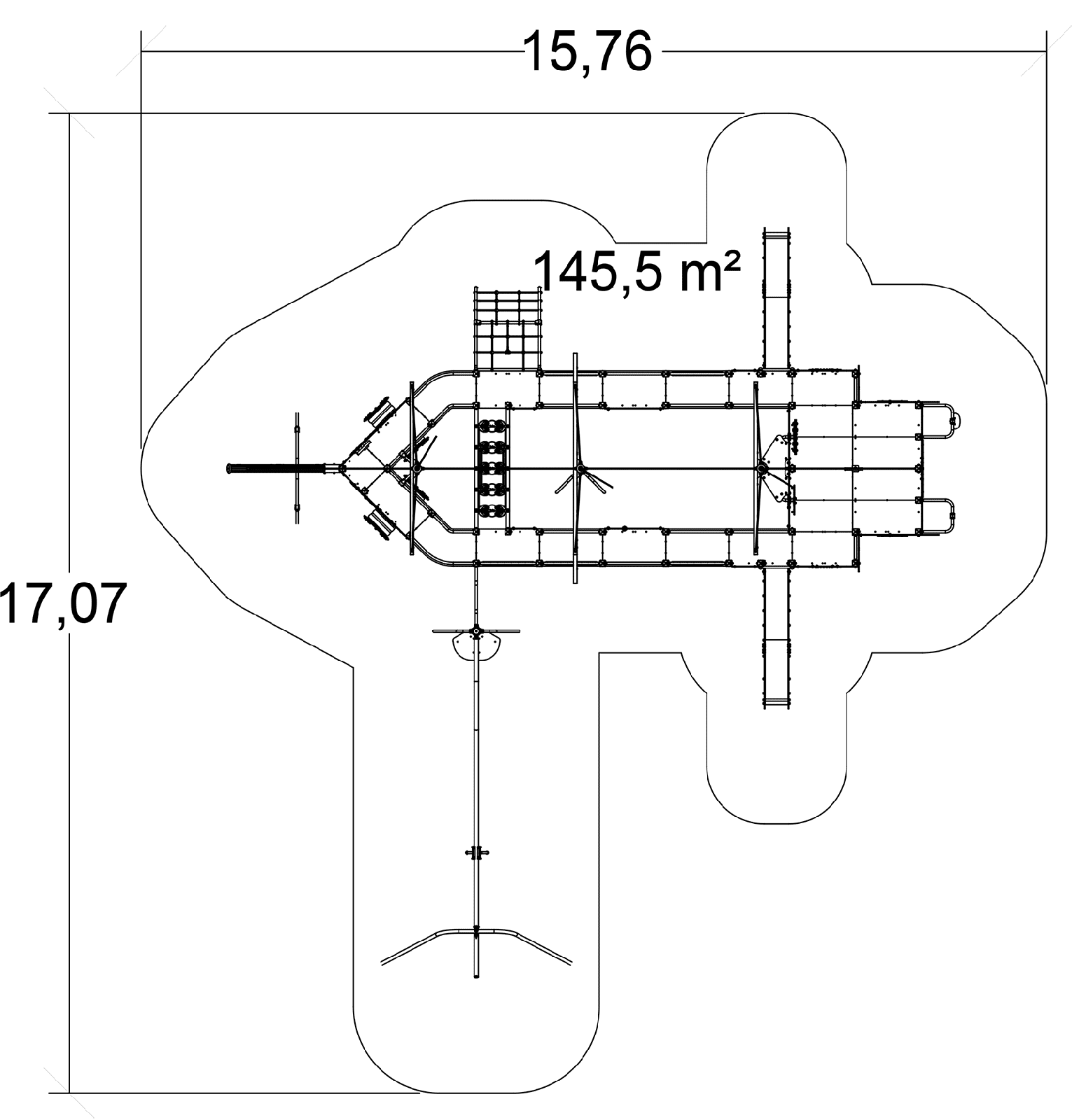 Das Modul hat folgende Abmessungen: 13,09 m Länge, 12,69 m Breite, 6,90 m Höhe. Die Fallhöhe beträgt 1,70 m.