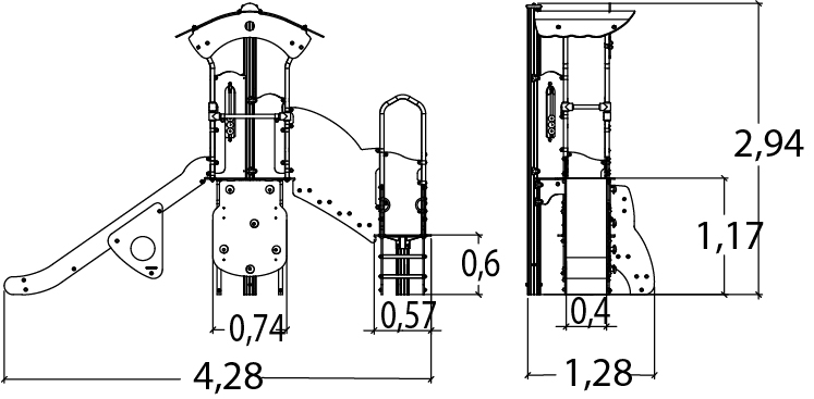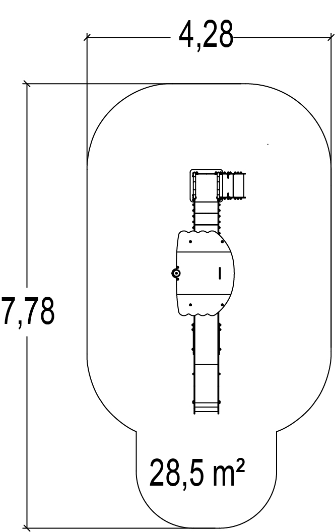 Das Modul hat folgende Abmessungen: 4,28 m Länge, 1,28 m Breite, 2,94 m Höhe. Die Fallhöhe beträgt 1,17 m.
