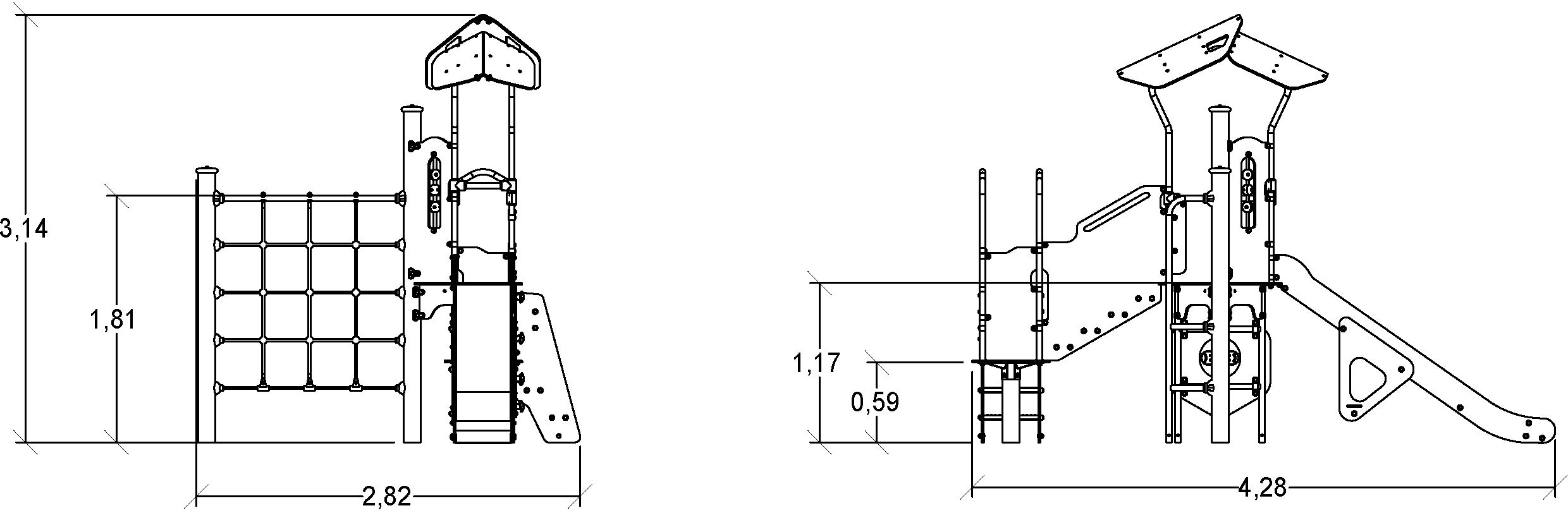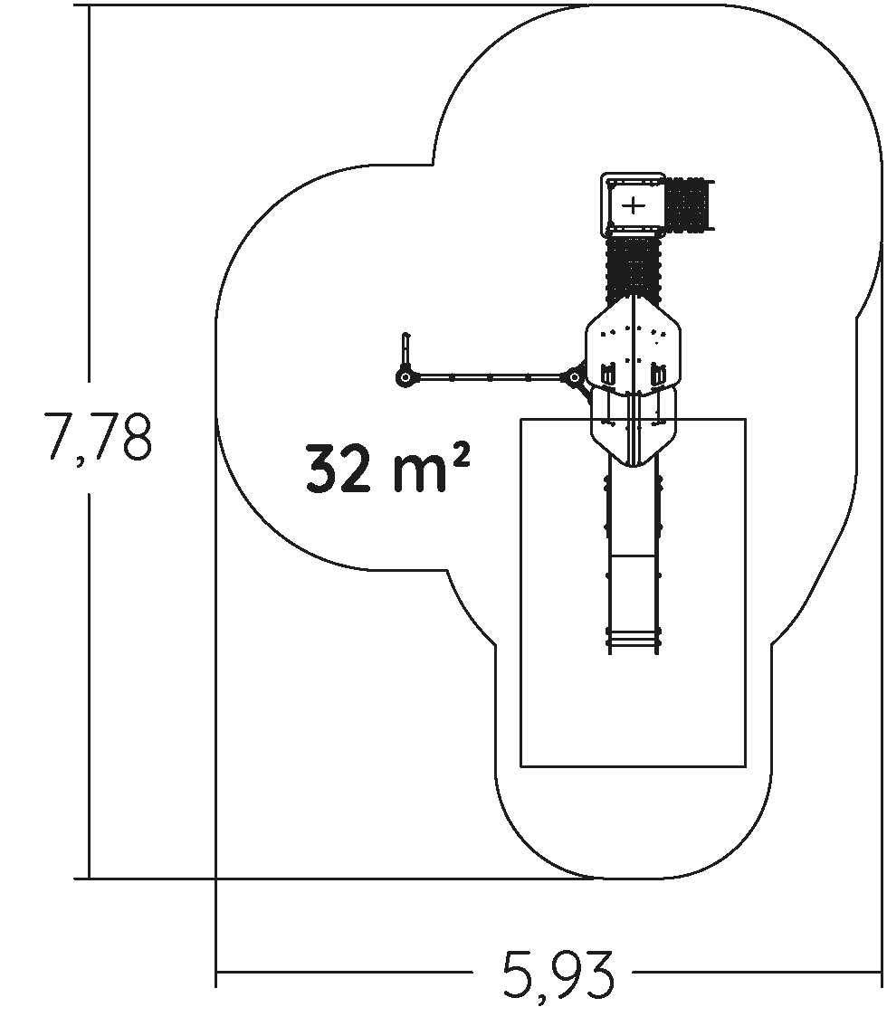 Das Modul hat folgende Abmessungen: 4,28 m Länge, 2,82 m Breite, 3,14 m Höhe. Die Fallhöhe beträgt 1,80 m.