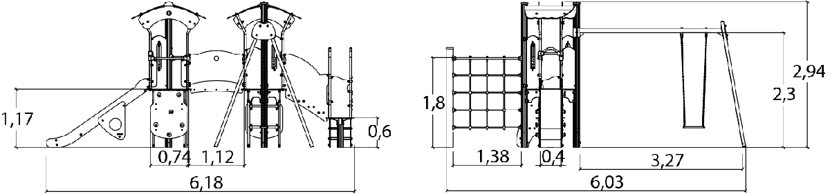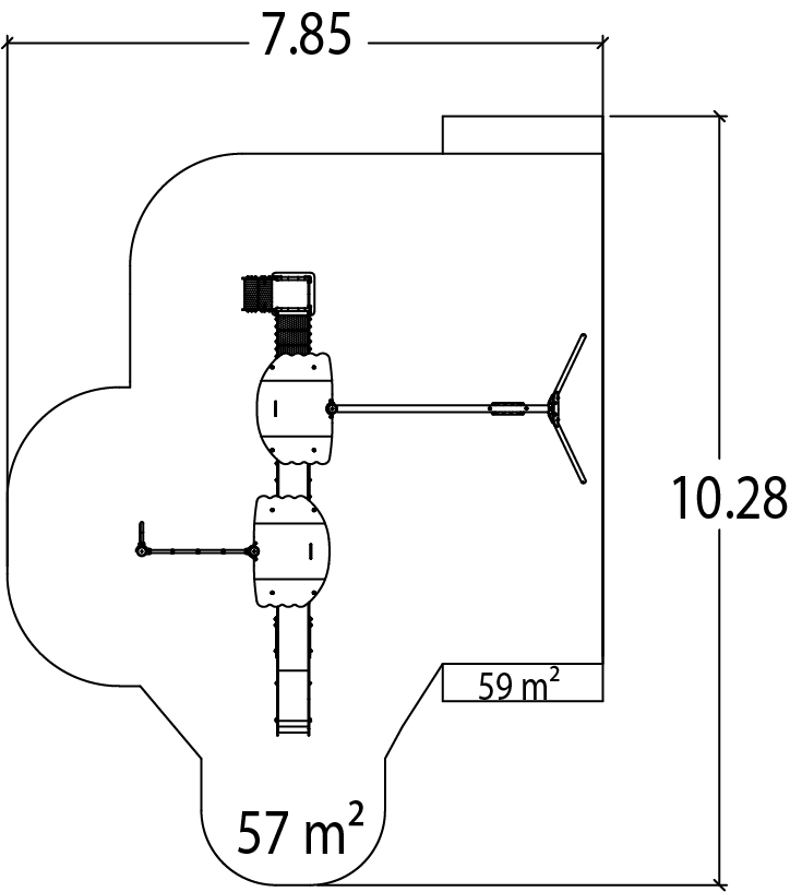 Das Modul hat folgende Abmessungen: 6,18 m Länge, 6,03 m Breite, 2,94 m Höhe. Die Fallhöhe beträgt 1,80 m.