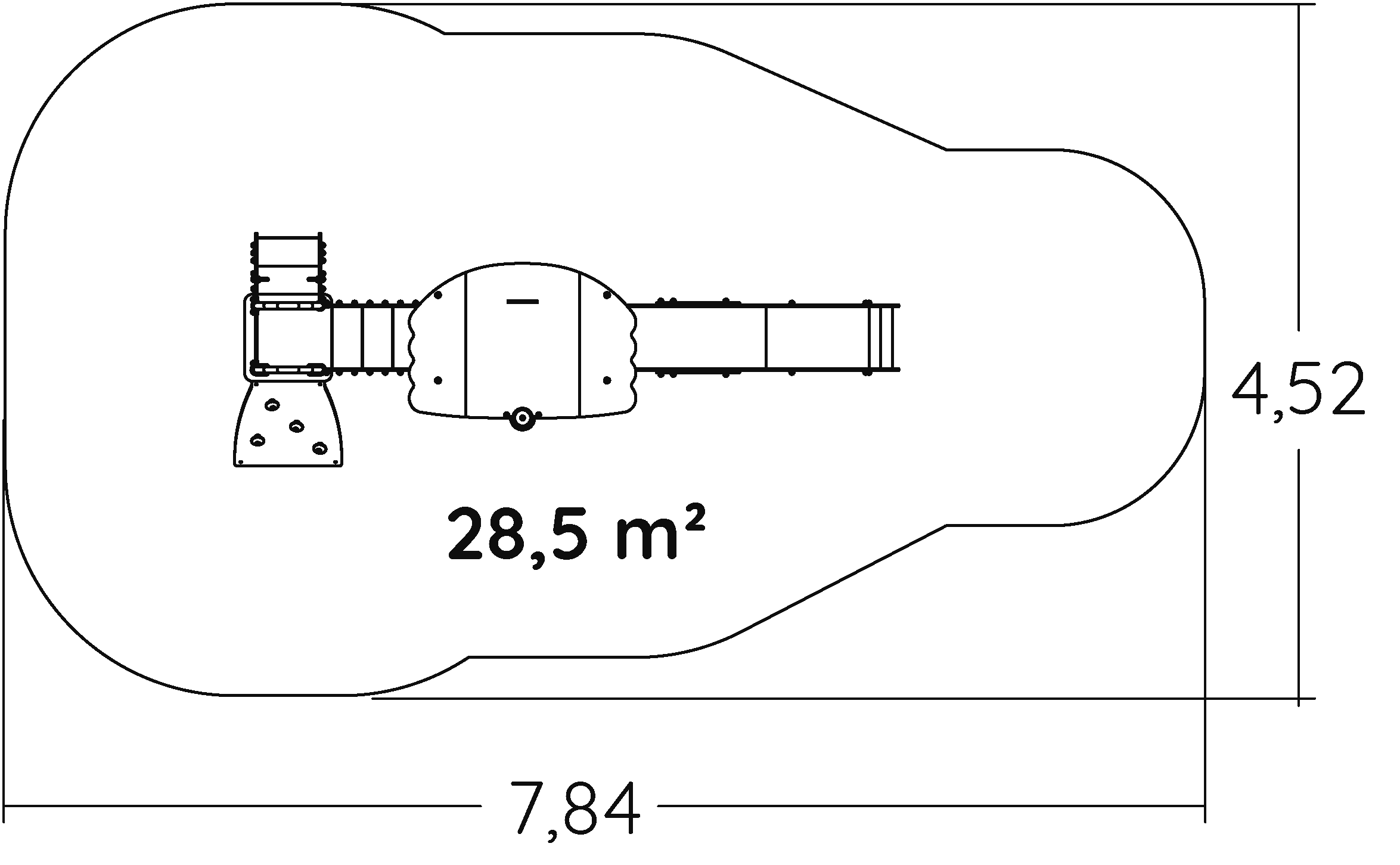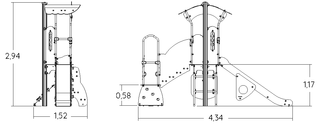 Das Modul hat folgende Abmessungen: 4,34 m Länge, 1,52 m Breite, 2,94 m Höhe. Die Fallhöhe beträgt 1,17 m.