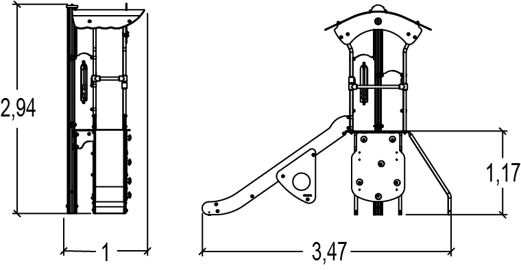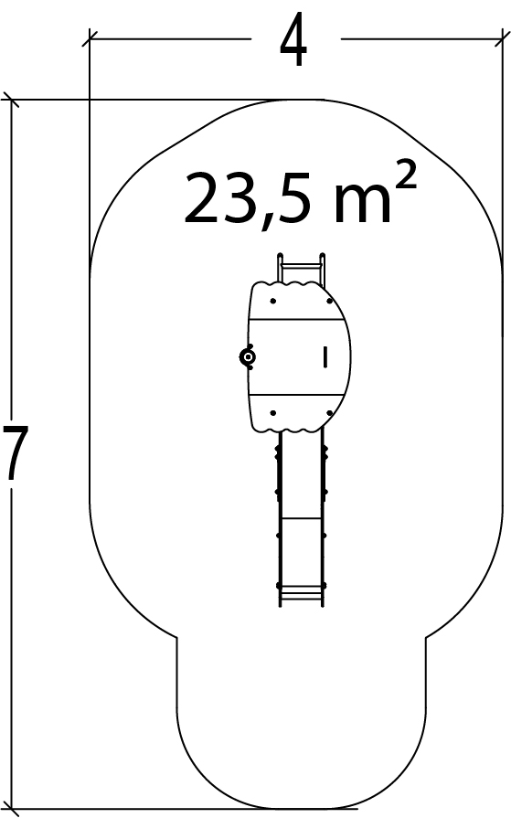 Das Modul hat folgende Abmessungen: 3,47 m Länge, 1,09 m Breite, 2,94 m Höhe. Die Fallhöhe beträgt 1,17 m.