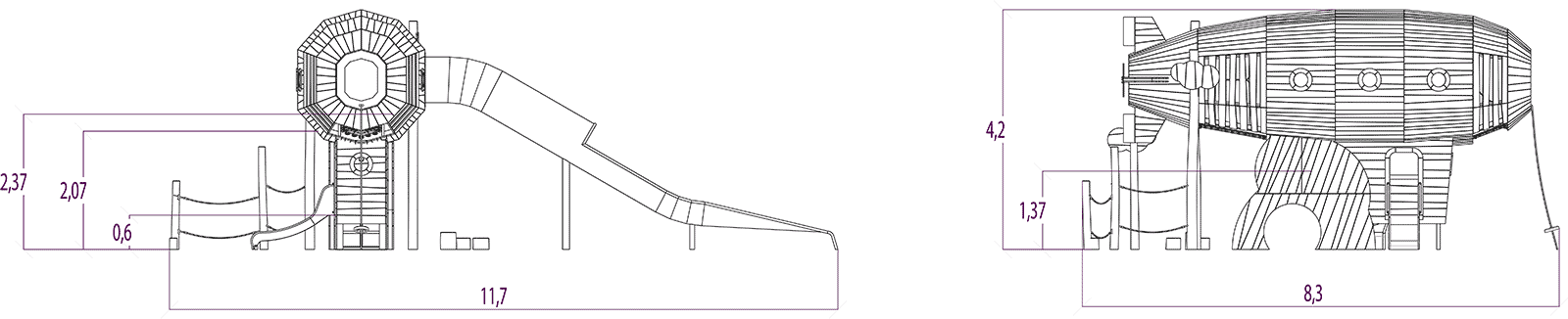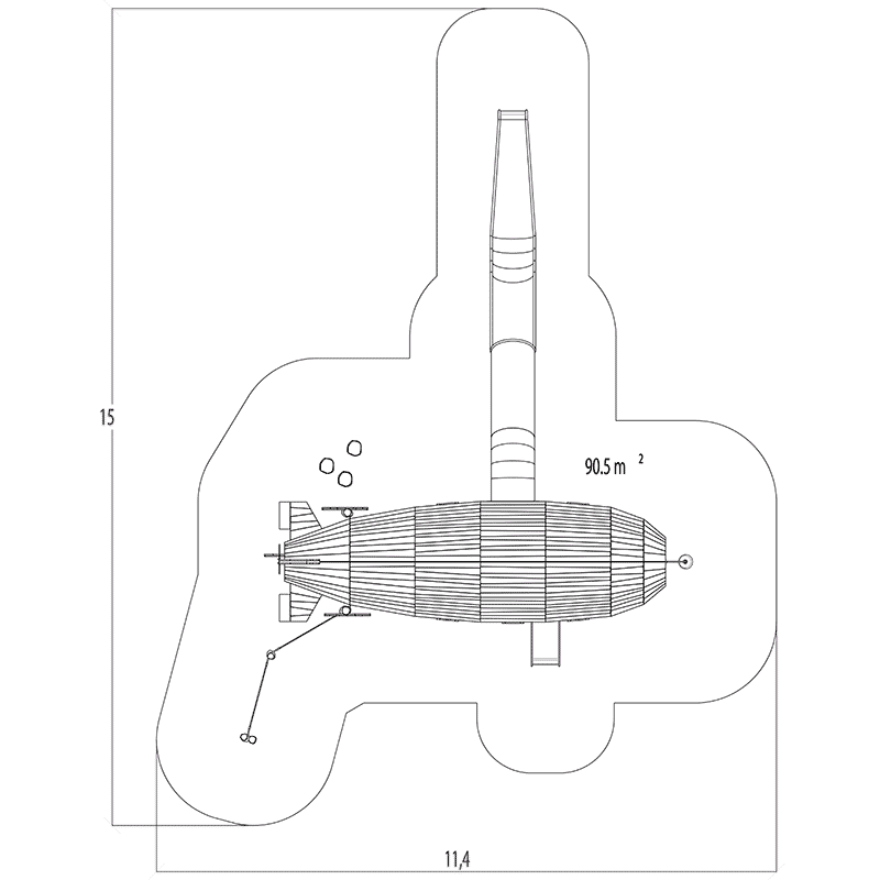 Das Modul hat folgende Abmessungen: 11,70 m Länge, 8,30 m Breite, 4,20 m Höhe. Die Fallhöhe beträgt 1,50 m.