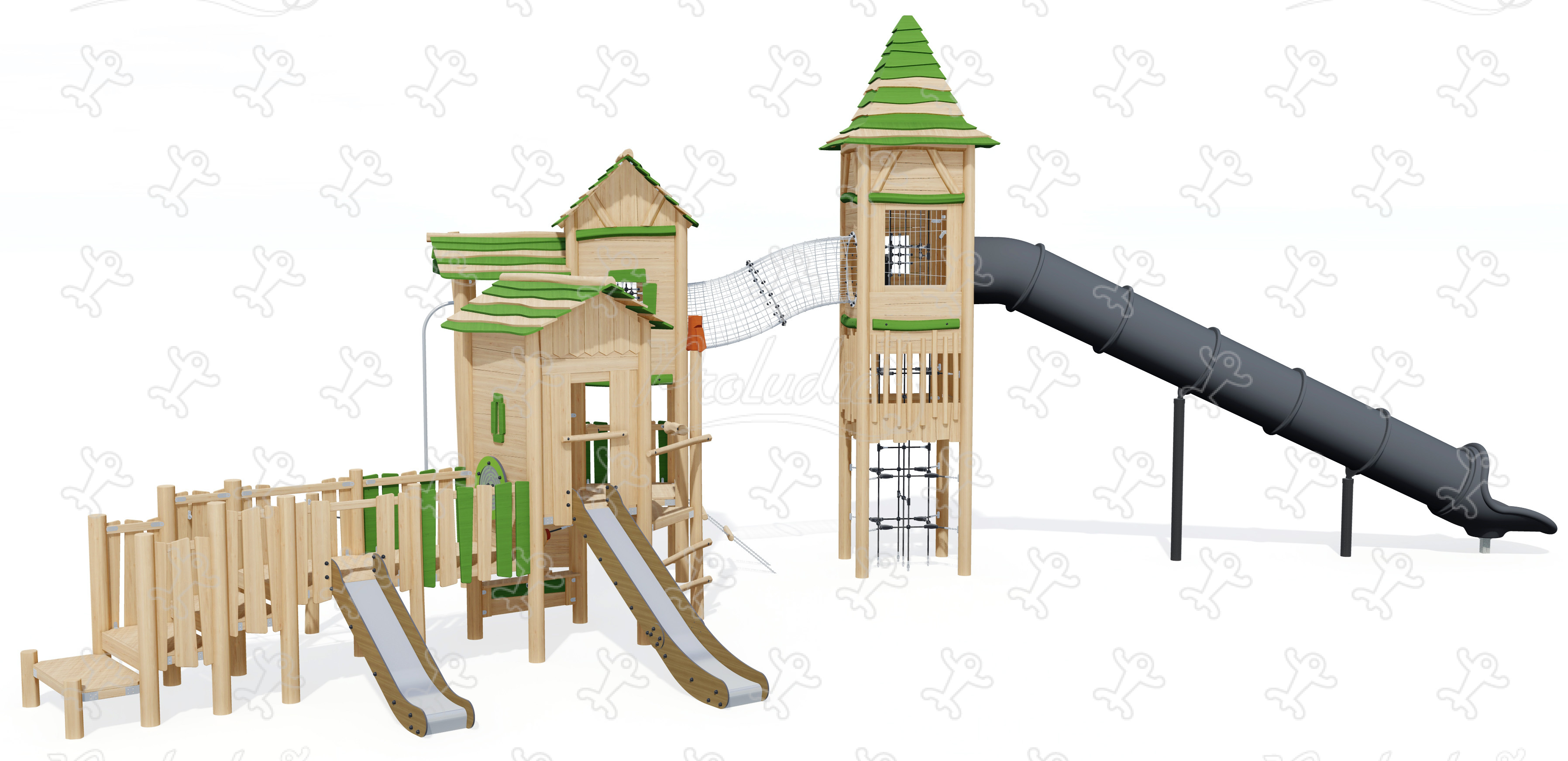Grünes Dorf – Riesiges Spielgerät aus Holz mit Röhrenrutschen und hohen Türmen - J49212®