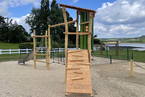 Holzspielanlage mit Rutsche, Netzwand und Kletterwand mit grün lackierten Elementen - J4932-V