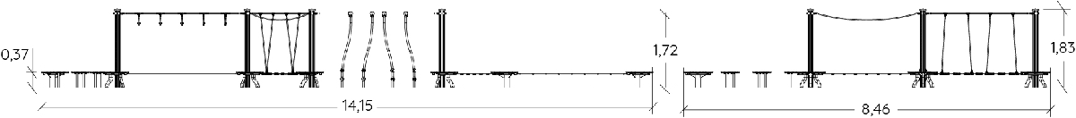 Das Modul hat folgende Abmessungen: 14,15 m Länge, 8,46 m Breite, 1,80 m Höhe. Die Fallhöhe beträgt 0,60 m.