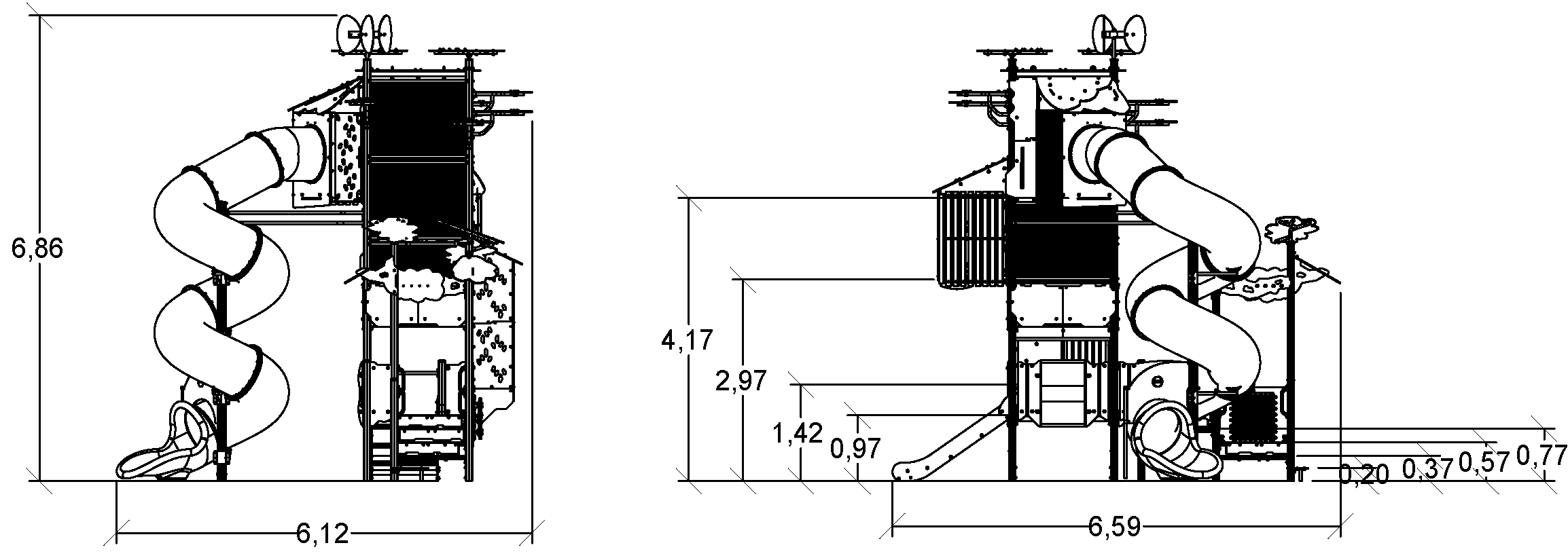 Das Modul hat folgende Abmessungen: 6,62 m Länge, 6,12 m Breite, 6,86 m Höhe. Die Fallhöhe beträgt 1,00 m.