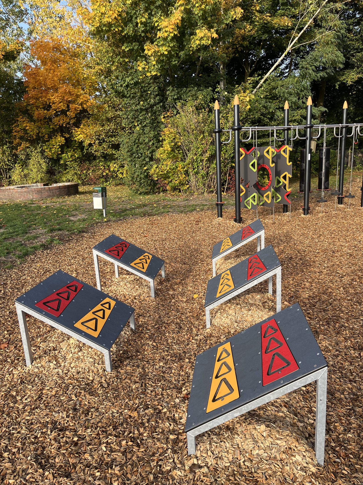 Alle eingesetzten Geräte erfüllen die DIN EN 1176 und wurden durch den TÜV zertifiziert. Die verwendeten Materialien – wie pulverbeschichteter Stahl und rutschhemmende Oberflächen – garantieren Robustheit und Langlebigkeit. Ein harmonisch eingebetteter Fallschutzbelag sichert zusätzlich die Nutzungssicherheit. Die offene Raumgestaltung unterstützt die Orientierung und schafft Sichtbeziehungen, die soziale Interaktion fördern.