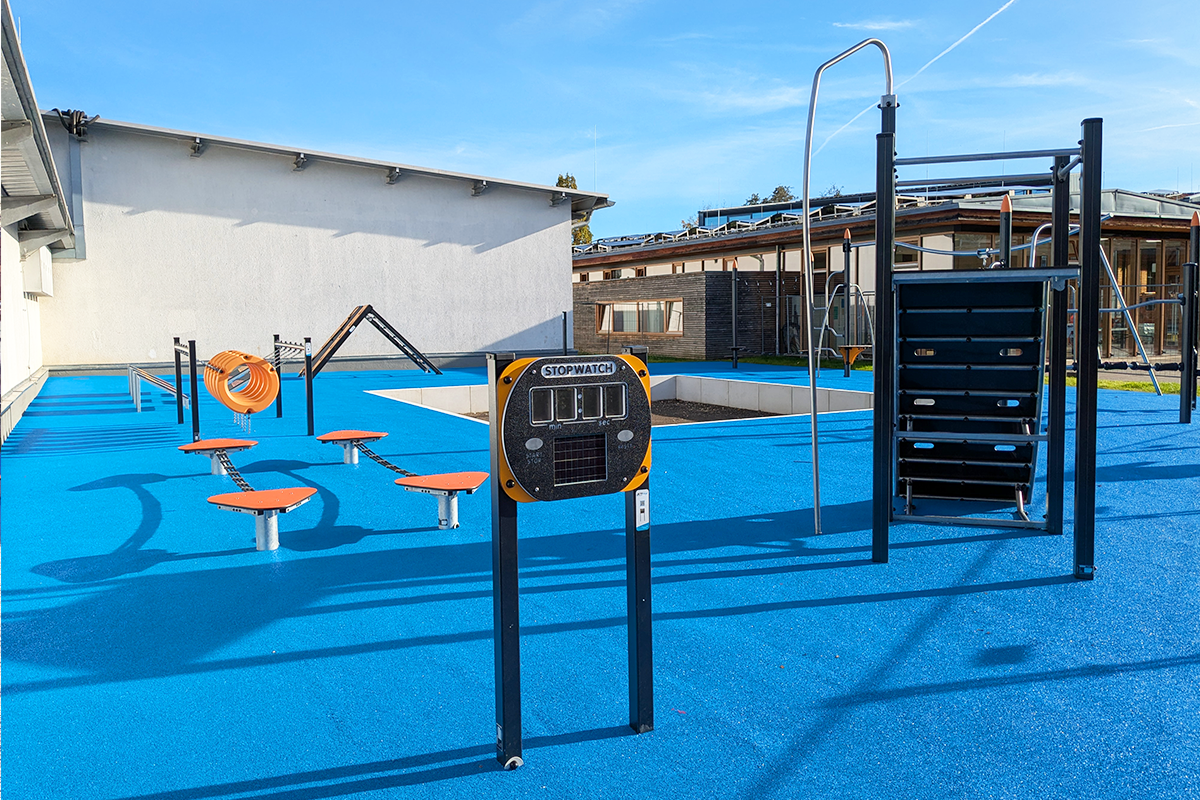 An der Staufer-Gemeinschaftsschule in Waiblingen entstand mit dem ACTI´Ninja Parcours eine vielseitige und zukunftsorientierte Bewegungslandschaft für den Schulhof. Die Anlage kombiniert sportliche Herausforderung mit spielerischem Wettbewerb und schafft einen attraktiven Treffpunkt für Bewegung, Training und soziale Interaktion. Elemente wie Parcourswand, Stoppuhr, Slackline, Reifenparcours, Sprungbretter „Fünfsprung“, Rampe mit Kletterseil, Sprung- und Balancierblöcke, Seilparcours mit Seilbahn sowie ein Balancierpfad ermöglichen abwechslungsreiche Bewegungsabläufe und fördern gezielt Koordination, Kraft, Schnelligkeit und Gleichgewicht.