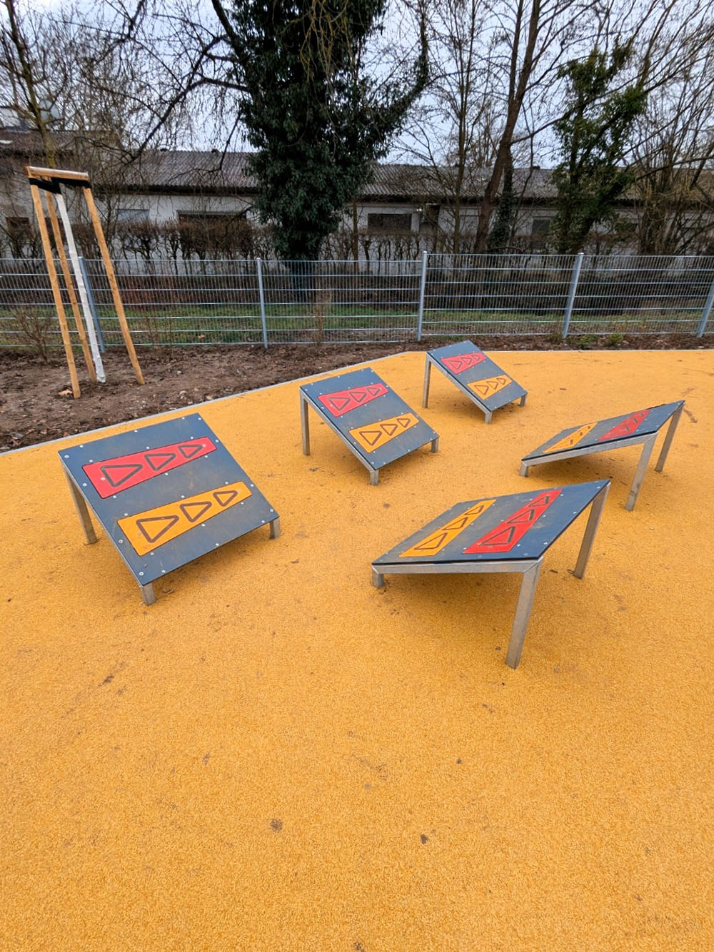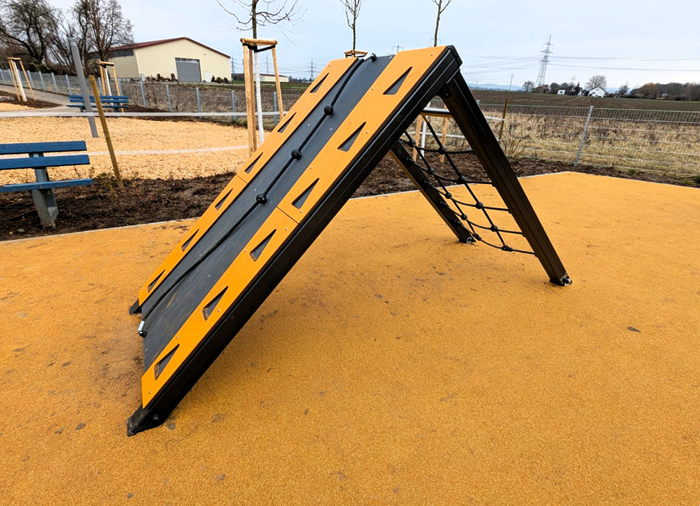 Sämtliche Geräte entsprechen der aktuellen Norm DIN EN 1176 und wurden vom TÜV geprüft. Der flächendeckende Fallschutzbelag erhöht zusätzlich die Sicherheit. Verwendet wurden langlebige Materialien, die den Anforderungen im öffentlichen Raum gerecht werden – robust, wartungsarm und witterungsbeständig.