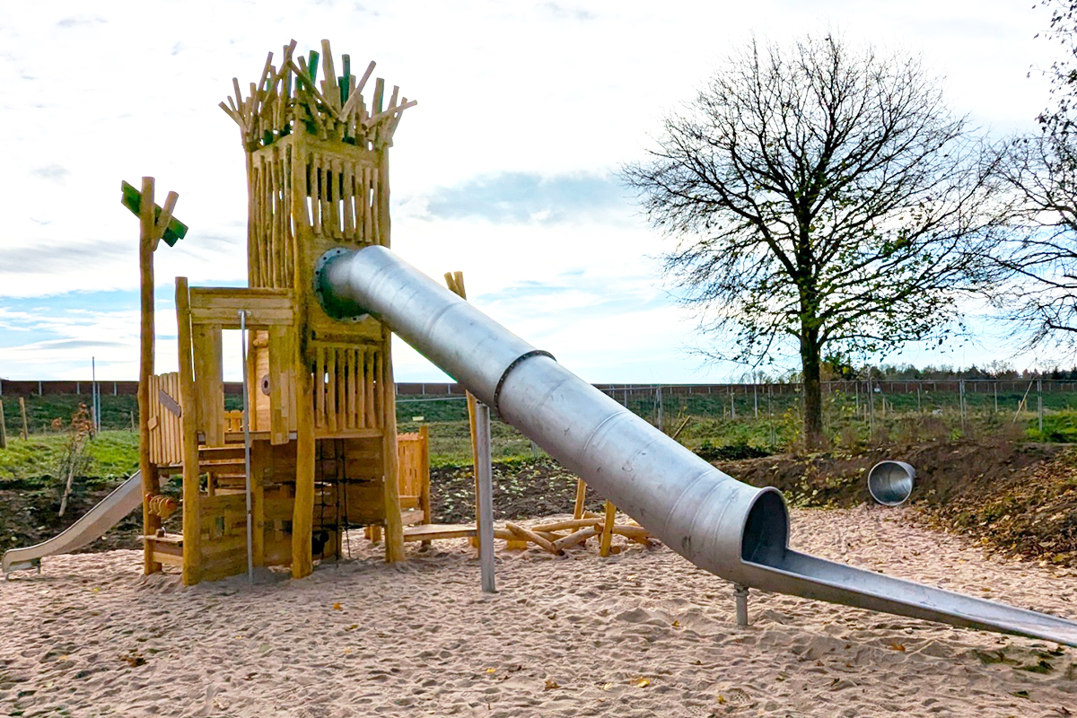 Materialien: Naturbelassenes Holz, taktile Elemente, Edelstahlrutschen