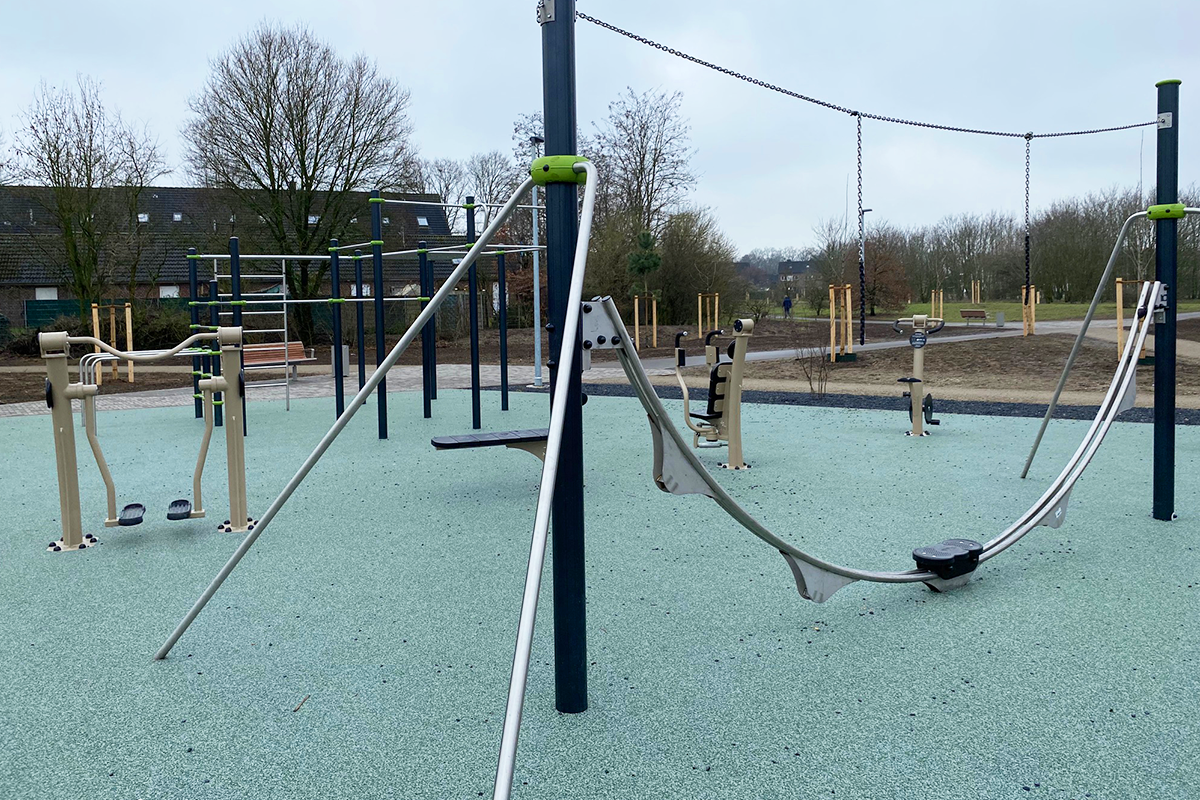 Ergänzt wird das Spielangebot durch einen 180 m² großen Outdoor-Fitnessbereich. Geräte wie Reckstange, SitUp-Bank, Spinning-Rad oder Airwalker motivieren Jugendliche und Erwachsene zur körperlichen Betätigung – ein generationenübergreifendes Bewegungsangebot im öffentlichen Raum.