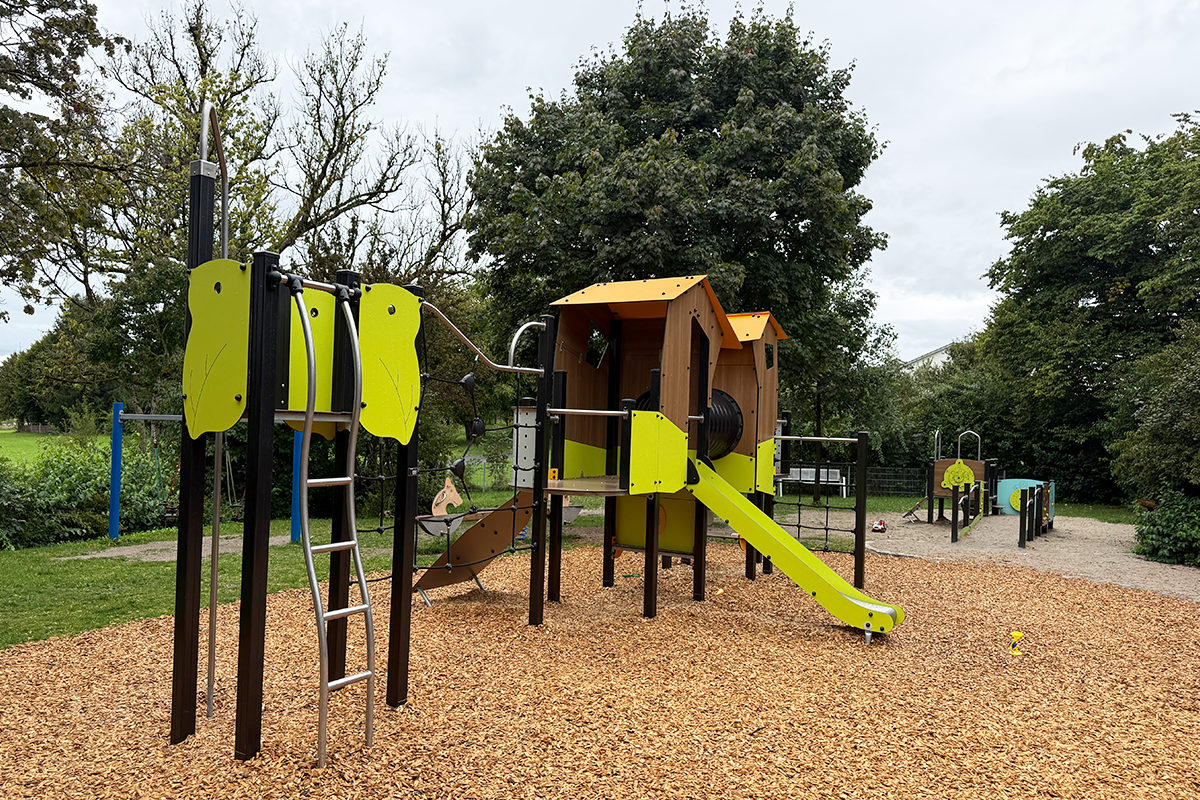 Alle Spielgeräte auf dem 180 m² großen Gelände entsprechen der Norm DIN EN 1176 und sind TÜV-zertifiziert. Robuste, wetterfeste Materialien garantieren Langlebigkeit und Wartungsfreundlichkeit – zentrale Anforderungen für Kommunen und Landschaftsarchitekten, die auf wirtschaftliche und nachhaltige Lösungen setzen. Die Abenteuerland-Geräte decken eine Vielzahl von Bewegungs- und Wahrnehmungsanreizen ab: Klettern, Balancieren, Rutschen, Rollenspiele und taktile Stimulation fördern motorische und kognitive Entwicklung zugleich.