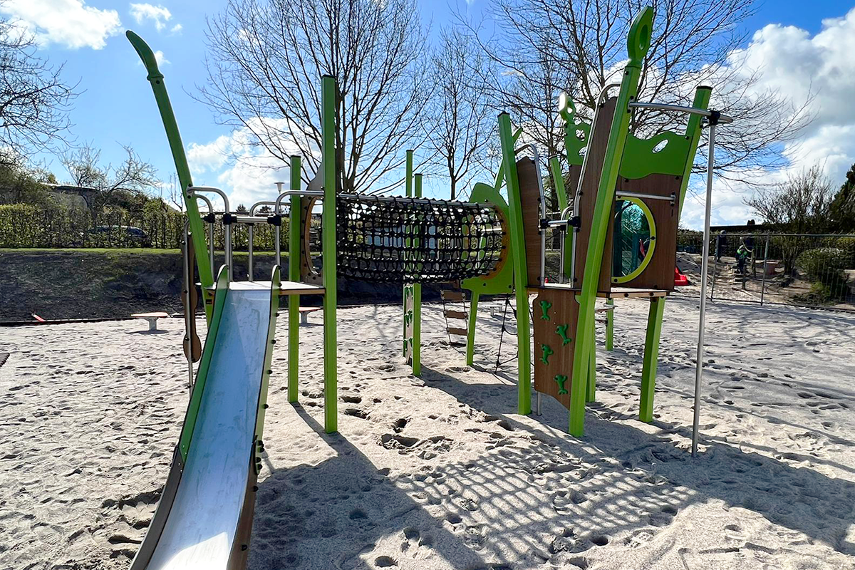 Zentrales Element ist eine Kanope Spielkombination mit Rutsche, Kletterelementen und Balancierpfad, die vielfältige motorische Herausforderungen bietet. Ergänzt wird das Angebot durch eine Doppelschaukel, die gemeinsames Schwingen ermöglicht, sowie das Federspielgerät „Wald“ mit acht Sitzplätzen, das insbesondere soziale Interaktion und Gruppenspiel stärkt. Eine Slackline erweitert das Angebot um einen gezielten Balancier- und Koordinationsbereich. Die Kombination der Spielgeräte unterstützt die Entwicklung von Gleichgewicht, Kraft, Geschicklichkeit und fördert zugleich Fantasie und kommunikative Fähigkeiten.