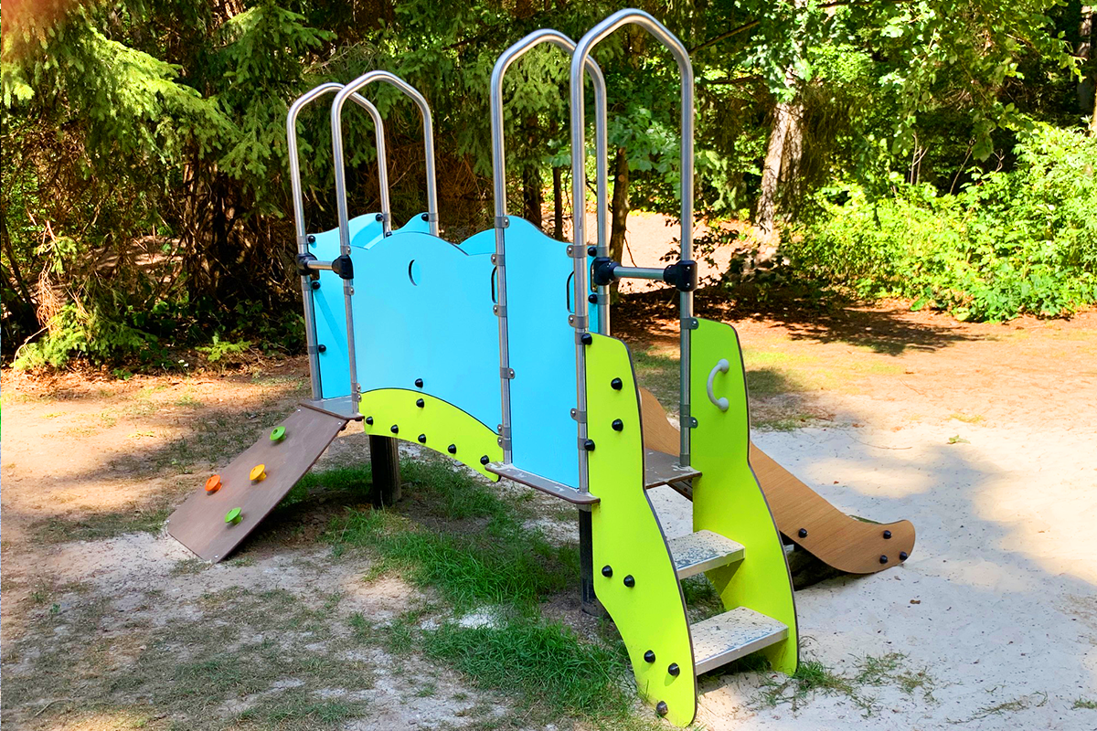- Die Diabolo-Spielanlage bietet altersgerechte Kletter- und Rutschelemente in klar strukturierter, farblich akzentuierter Gestaltung.