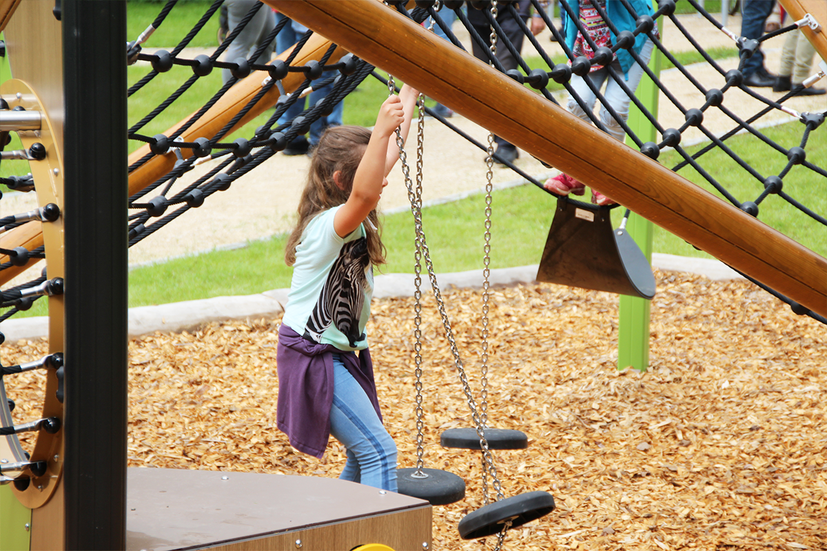 Die Wahl der Spielgeräte fiel auf langlebige, TÜV-zertifizierte Produkte von Proludic. Zentrales Element ist das Kanopé-Klettergerät mit Netz-Tunnel, Hängematte und dynamischen Kletterelementen – geeignet ab 3 Jahren und mit Platz für bis zu 22 Nutzer. Ergänzt wird das Angebot durch das Hip-Hop-Rotationsspielgerät mit Halte-Sitzen. Beide Geräte fördern Koordination, Interaktion und Fantasie. Funktionen wie Balancieren, Rutschen, Tasten und Greifen sorgen für vielfältige Sinneserfahrungen und stärken motorische sowie kognitive Fähigkeiten.
