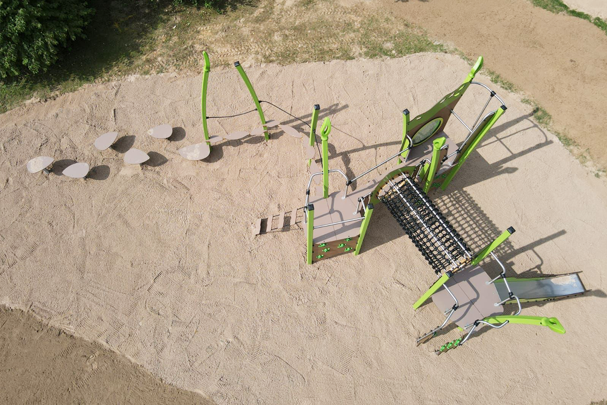 Das Herzstück der Anlage ist eine große Kanopé-Kombinationsspielanlage, die durch ihre naturnahe Optik harmonisch in die Umgebung eingebettet wurde. Ergänzt wird das Spielangebot durch eine Kleinkindrutsche, eine klassische Schaukel sowie das Hip Hop-Karussell. Alle Geräte entsprechen der europäischen Sicherheitsnorm EN 1176 und wurden vom TÜV zertifiziert. Sie bestehen aus langlebigen, wetterfesten Materialien wie Metall, Kunststoff und Holzkomponenten.