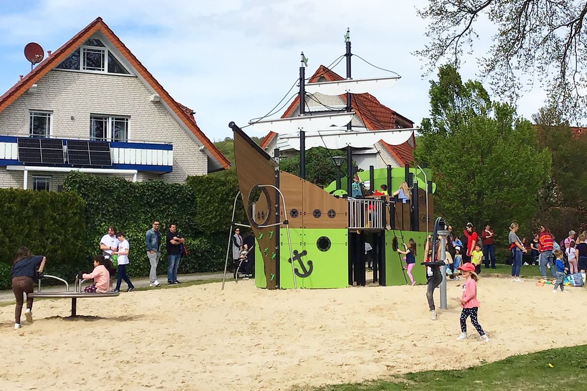 Prägendes Element des Spielplatzes ist das Spielschiff Neptun aus der Aquatica-Reihe. Das Spielgerät in Bootsform kombiniert Rutsche, Kletterelemente und Spieltafeln und fördert insbesondere fantasievolles Rollenspiel sowie motorische Fähigkeiten. Ergänzt wird das zentrale Spielangebot durch dynamische Bewegungsgeräte wie das Karussell GyroSpeed, Calypso, Hip-Hop und ein Trampolin, die Koordination, Gleichgewicht und gemeinsames Erleben unterstützen.