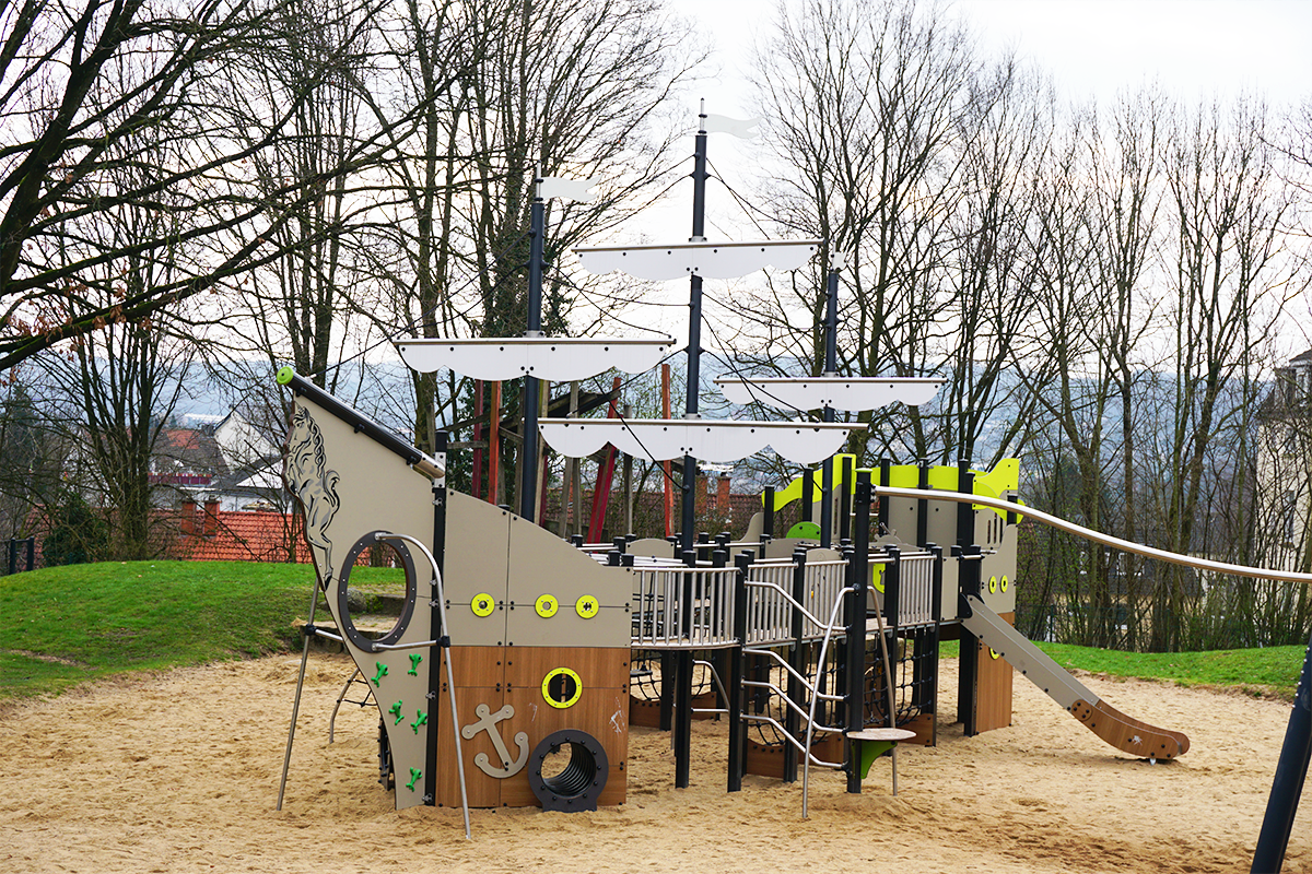 Zentrales Spielelement ist der imposante Dreimaster „Einhorn“ – ein großes Spielschiff mit Rutschen, Kletternetzen, Seilen, Spieltafeln und einer Feuerwehrstange. Es lädt Kinder zu Rollenspiel, Bewegung und sozialer Interaktion ein. Die Multispielanlage „Die Odyssee“ aus der Aquantica-Reihe erweitert das Spielangebot um maritime Kletterelemente und Balanciermöglichkeiten. Für temporeiche Erlebnisse sorgt die robuste Seilbahn „Skyrail“.